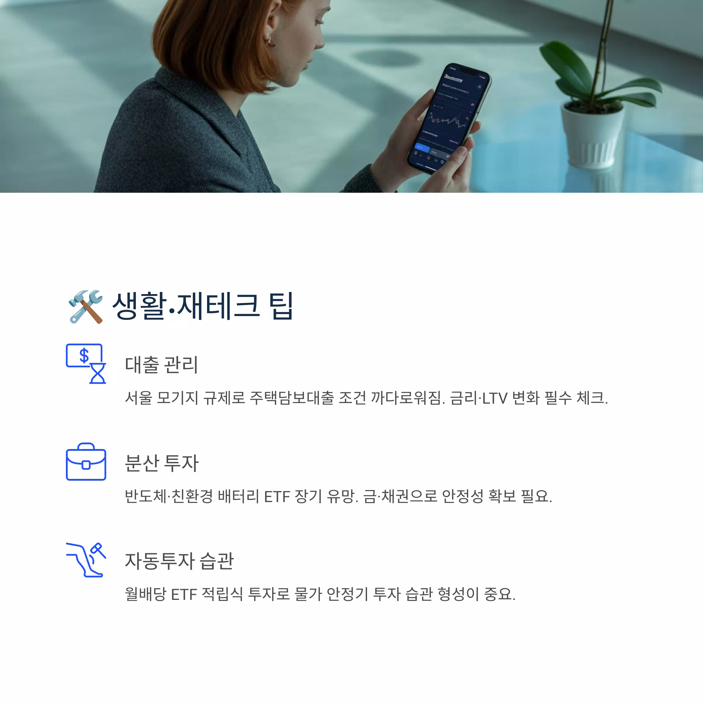 - 대출 관리: 서울 모기지 규제 강화로 주택담보대출 조건이 까다로워집니다. 신규 주택 구매 계획이 있다면 금리·LTV 변화 체크는 필수입니다.
