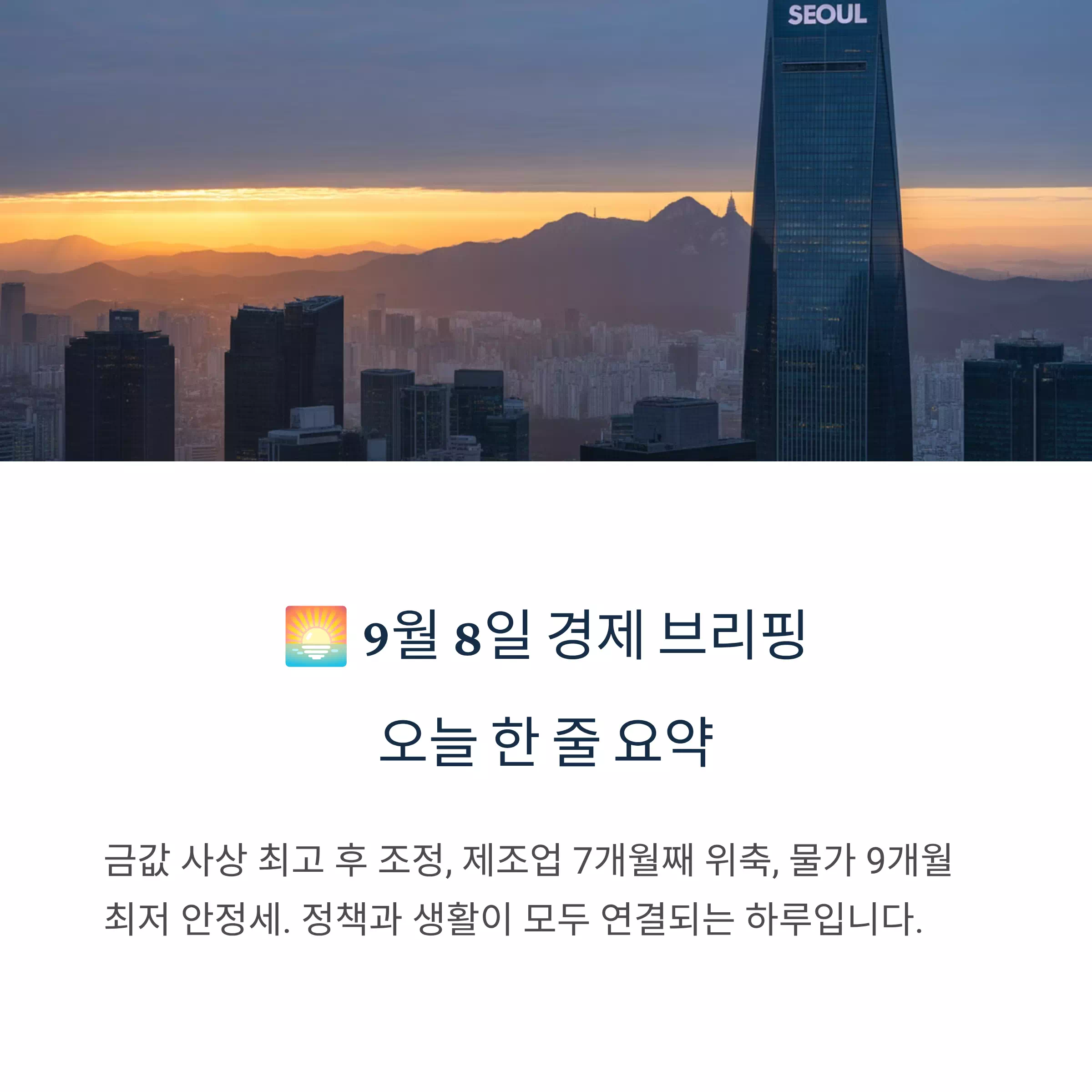 오늘 한 줄 요약: 금값은 사상 최고 이후 조정 중, 제조업은 7개월째 위축, 물가는 9개월 최저로 안정세. 여기에 정부의 구조 개혁, 현대차·미국 ICE 협상, 서울 모기지 규제까지 ‘정책+생활’ 모두 연결되는 하루입니다.