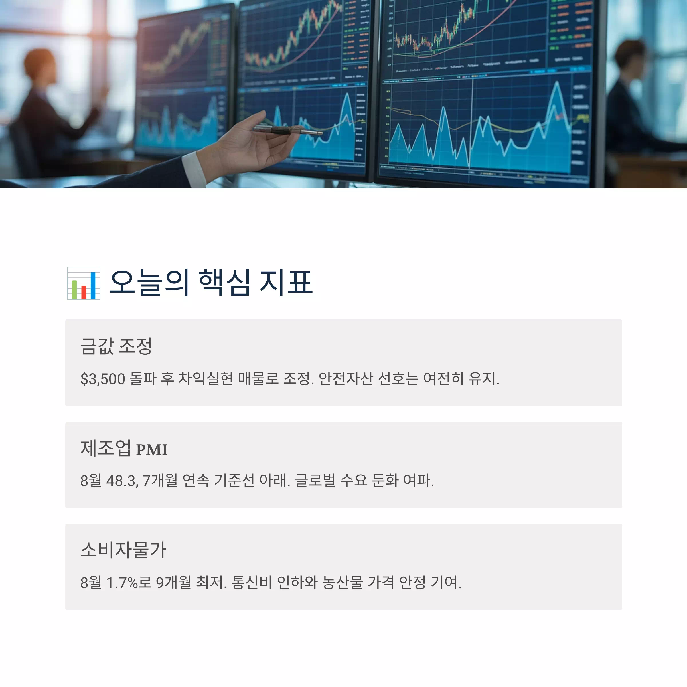 - 금값: 지난주 $3,500선을 돌파하며 최고가를 찍은 뒤 이번 주 초엔 차익실현 매물로 조정 흐름. 여전히 안전자산 선호는 유지되고 있어 “조정 속 강세” 국면으로 보는 시각이 많습니다.