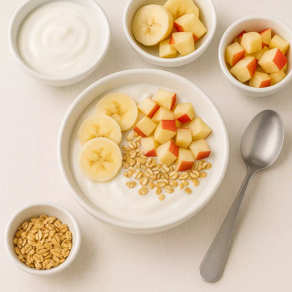 재료: 플레인 요거트, 바나나·사과 등 과일, 귀리 또는 그래놀라