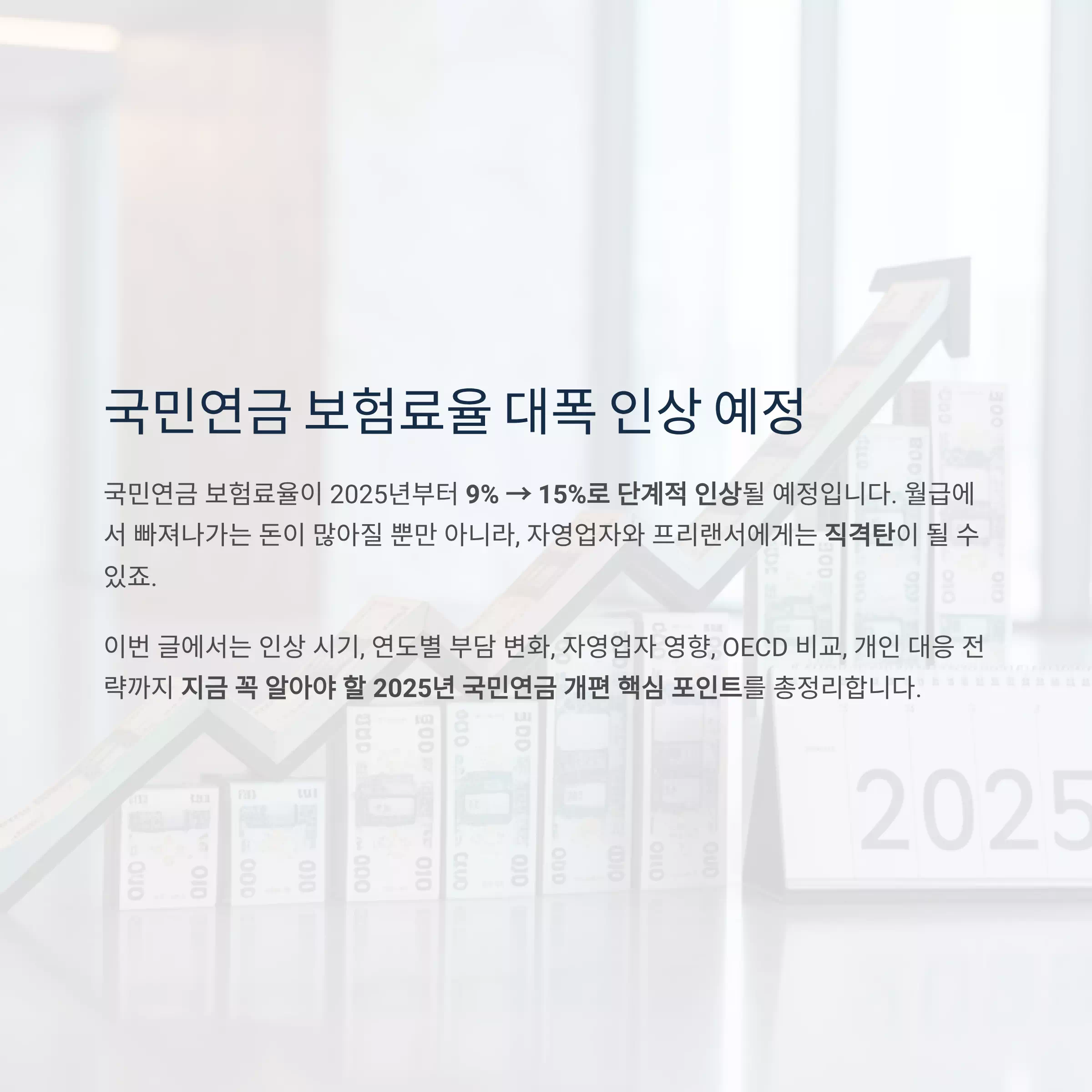 국민연금 보험료율이 2025년부터 9% → 15%로 단계적 인상될 예정입니다.