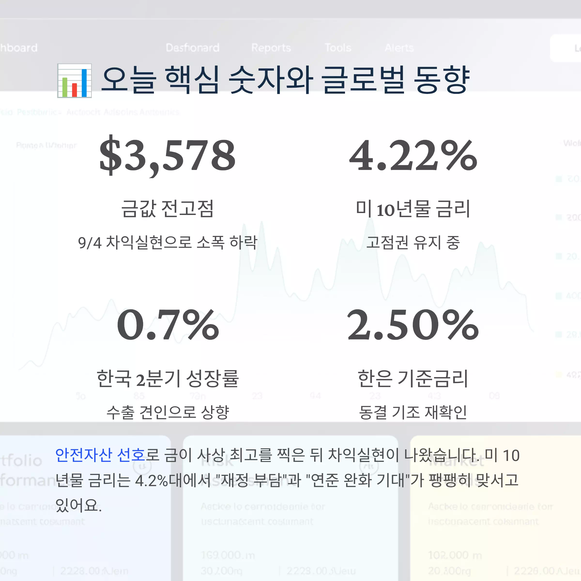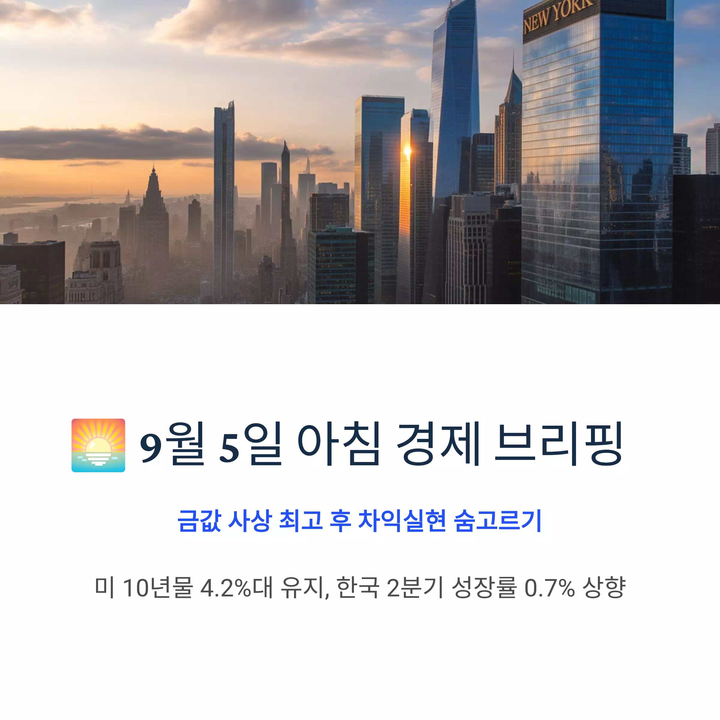 한 줄 요약: 금값은 사상 최고 후 차익실현으로 숨고르기, 미 10년물은 4.2%대 유지. 한국 2분기 성장률 0.7% 상향, 코스피는 미 고용지표 앞두고 관망세.
