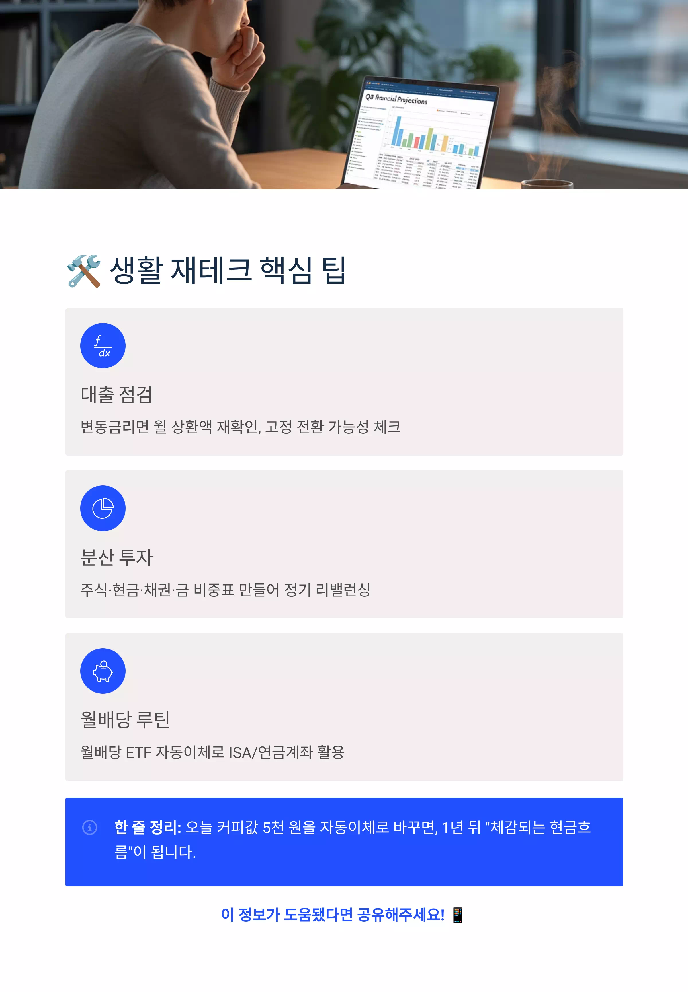 한 줄 정리: 오늘 커피값 5천 원을 자동이체로 바꾸면, 1년 뒤 “체감되는 현금흐름”이 됩니다. 뉴스는 습관을 만드는 트리거로 활용하세요.
