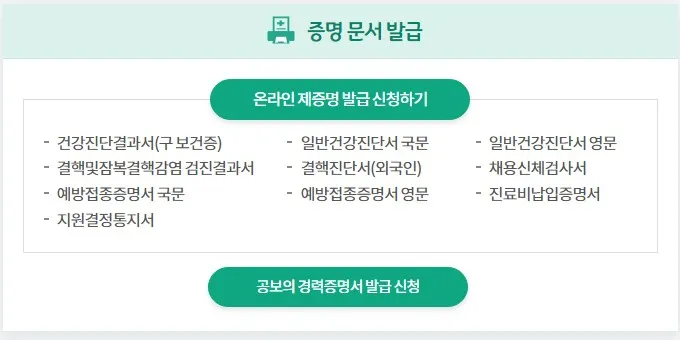 보건복지부와 한국사회보장정보원이 운영하는 온라인민원 서비스,건강진단결과서(구 보건증) 등 제증명 발급, 의료비지원 등 안내