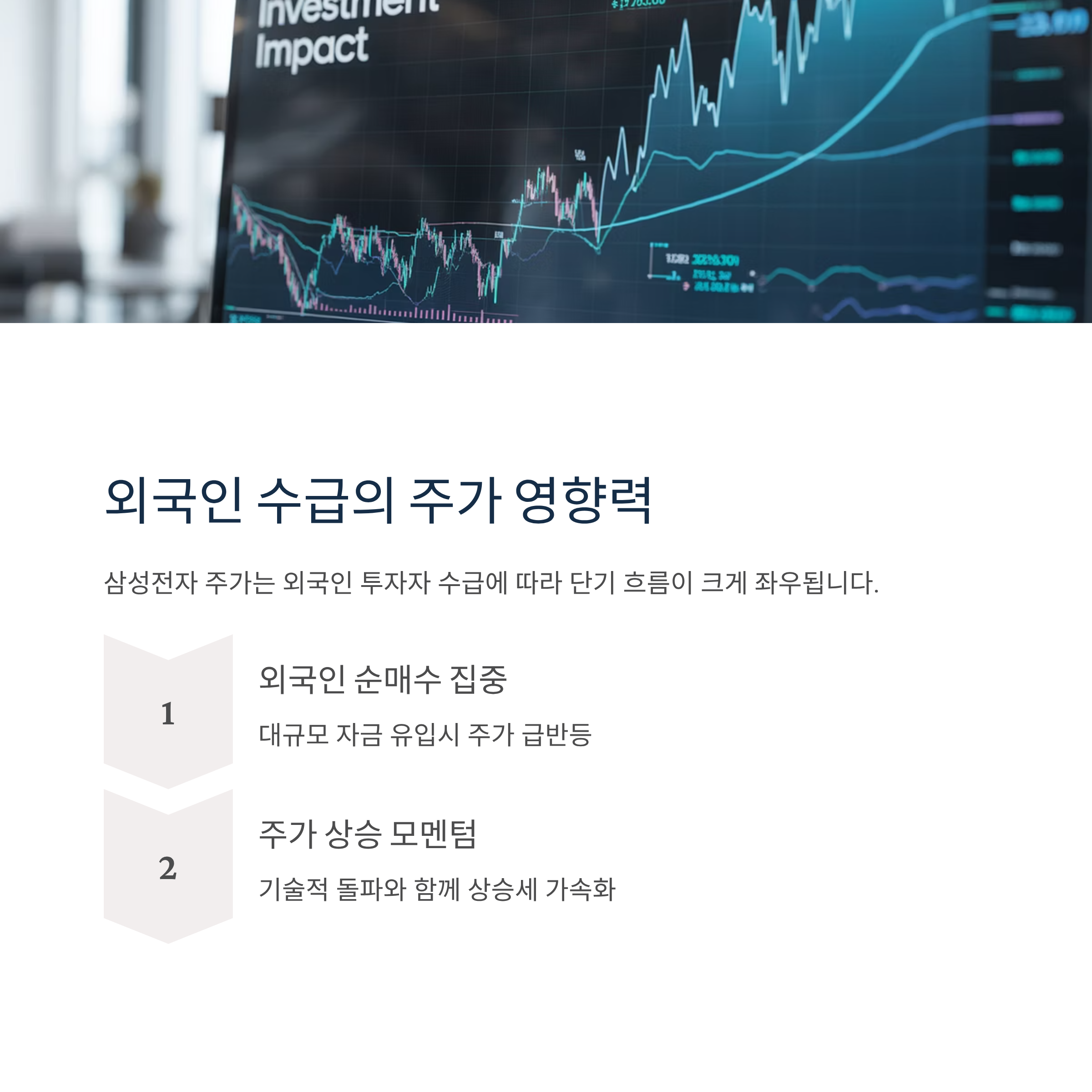 삼성전자 주가는 외국인 투자자의 수급에 따라 단기 흐름이 크게 움직입니다. 특히 외국인 순매수가 집중될 때 주가가 빠르게 반등하는 경향을 보이고 있어요.