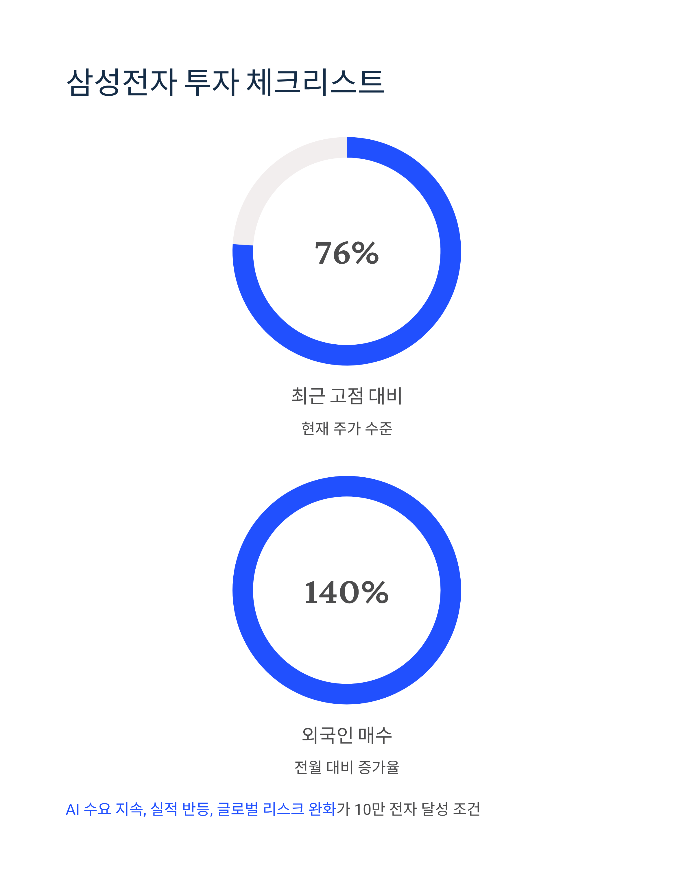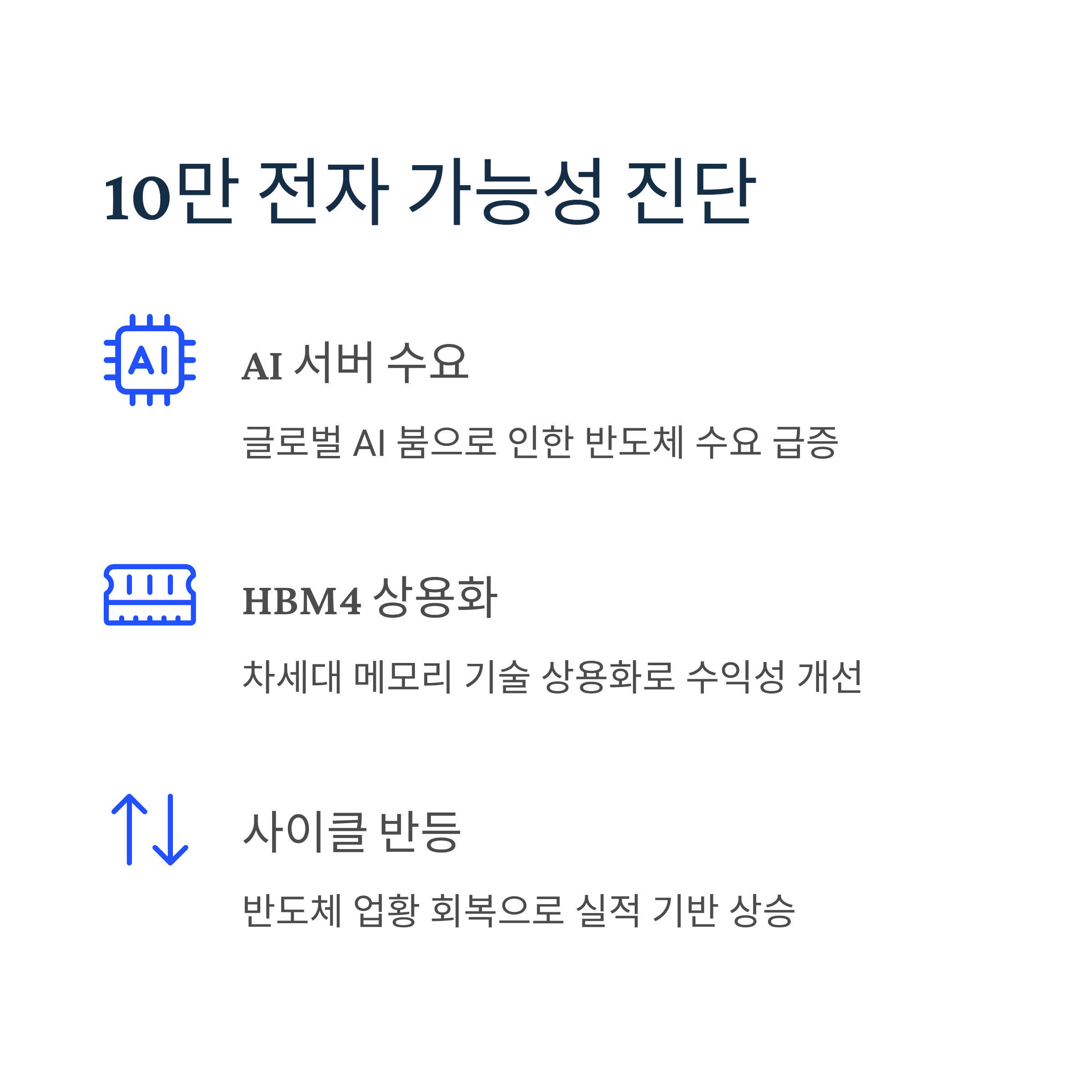 | 10만 전자 조건 | AI 수요 지속, 실적 반등, 글로벌 리스크 완화 |