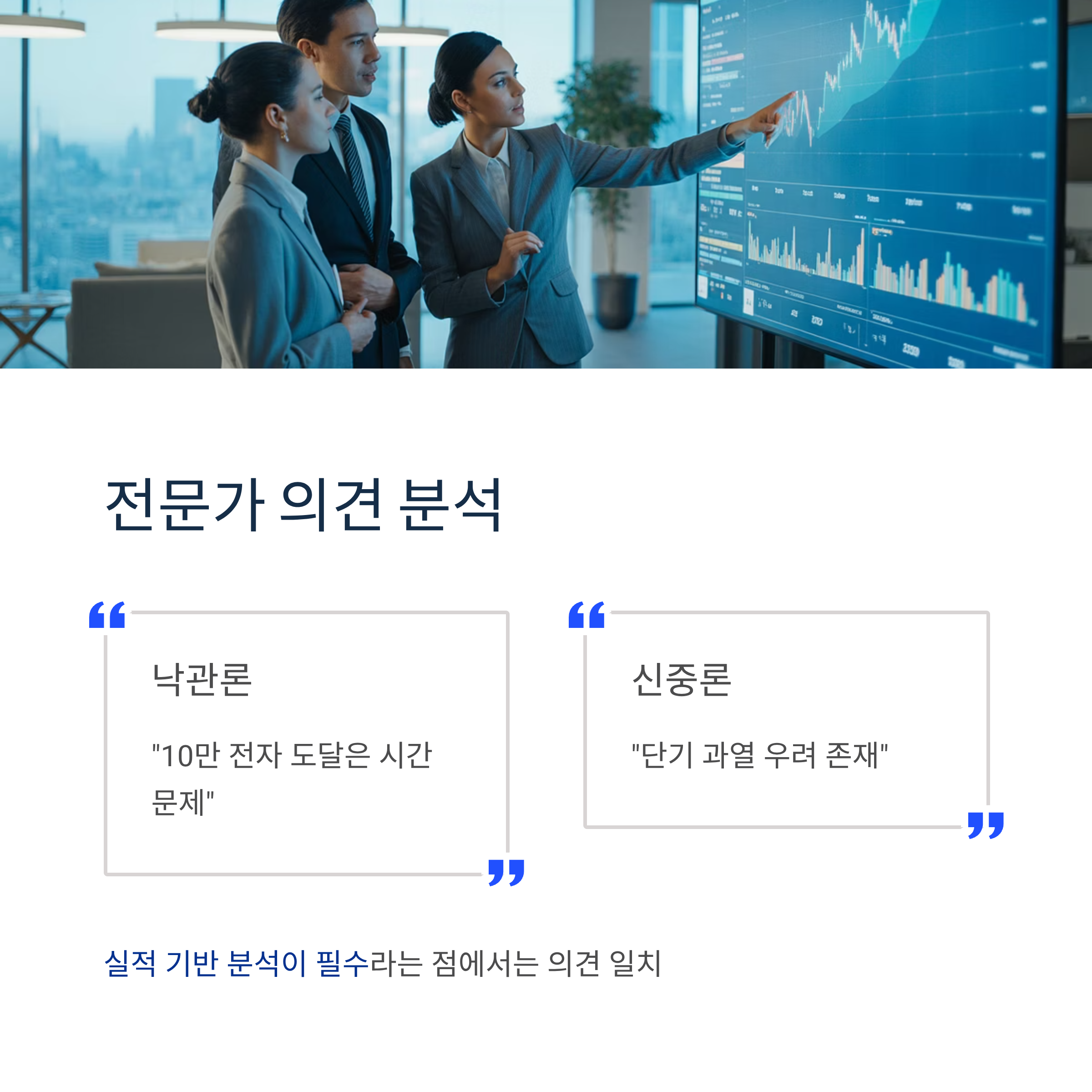일부 전문가는 “10만 전자 도달은 시간 문제”라고 분석하지만, 다른 쪽에서는 “단기 과열”에 대한 우려도 제기합니다. 따라서 실적 기반 분석이 필수입니다.