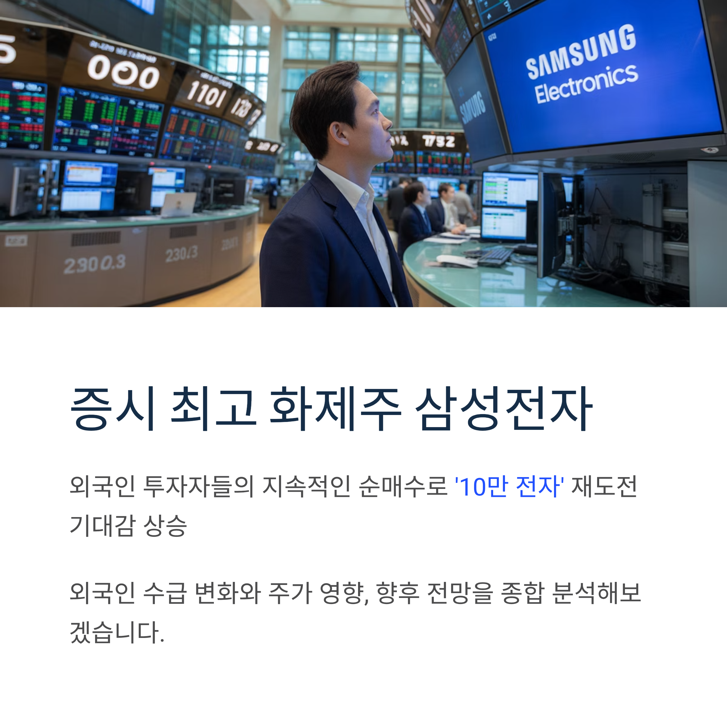 최근 증시에서 가장 뜨거운 종목 중 하나, 바로 삼성전자입니다. 특히 외국인 투자자들의 순매수 흐름이 이어지면서 '10만 전자' 재도전이 현실화되는 것이 아니냐는 기대감이 커지고 있습니다. 이 글에서는 외국인 수급 변화, 주가 영향, 향후 흐름 등을 자세히 살펴봅니다.