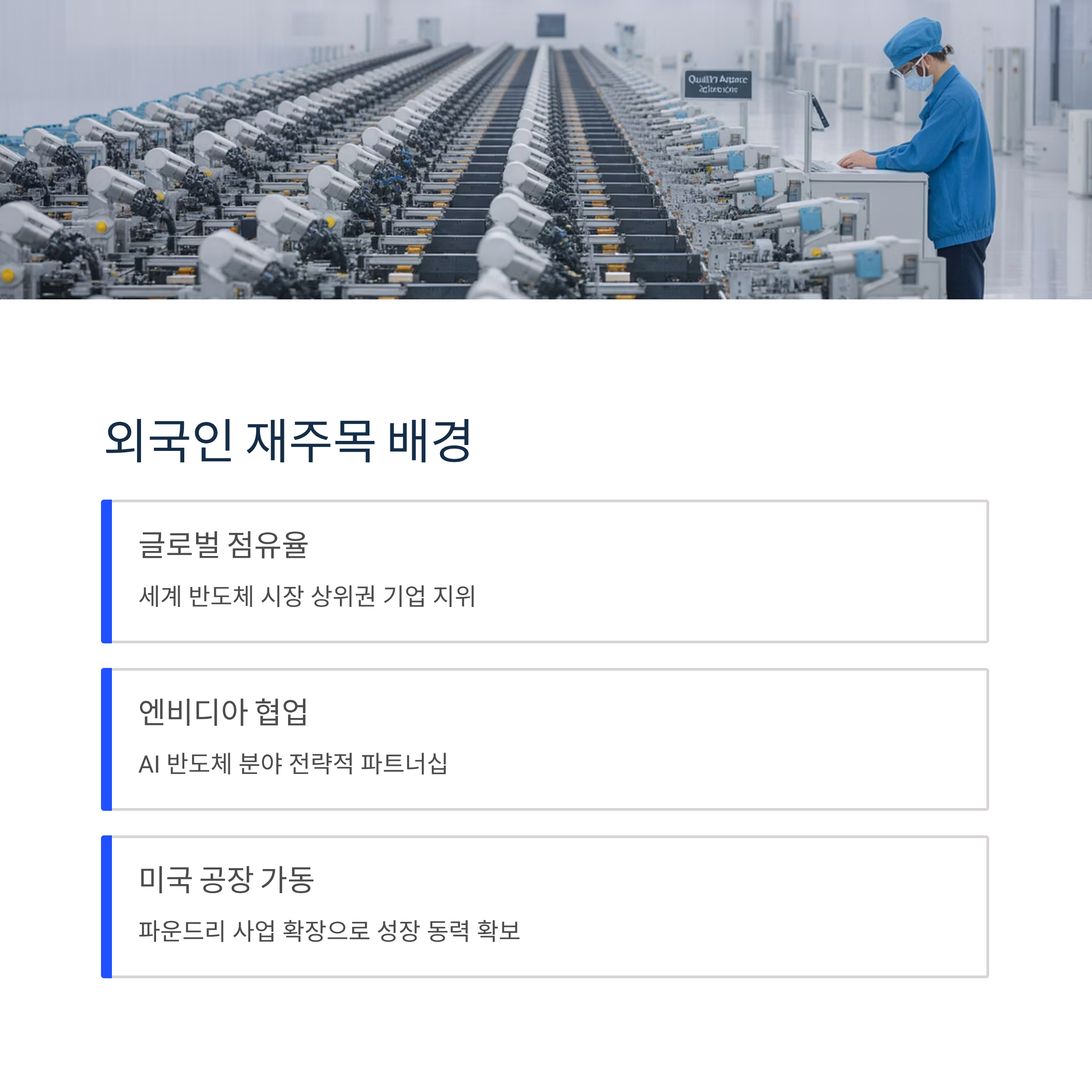 삼성전자는 글로벌 반도체 시장 점유율 상위 기업이며, 최근 엔비디아 협업, 미국 파운드리 공장 가동 등의 뉴스가 외국인 매수세에 긍정적인 영향을 주고 있습니다.
