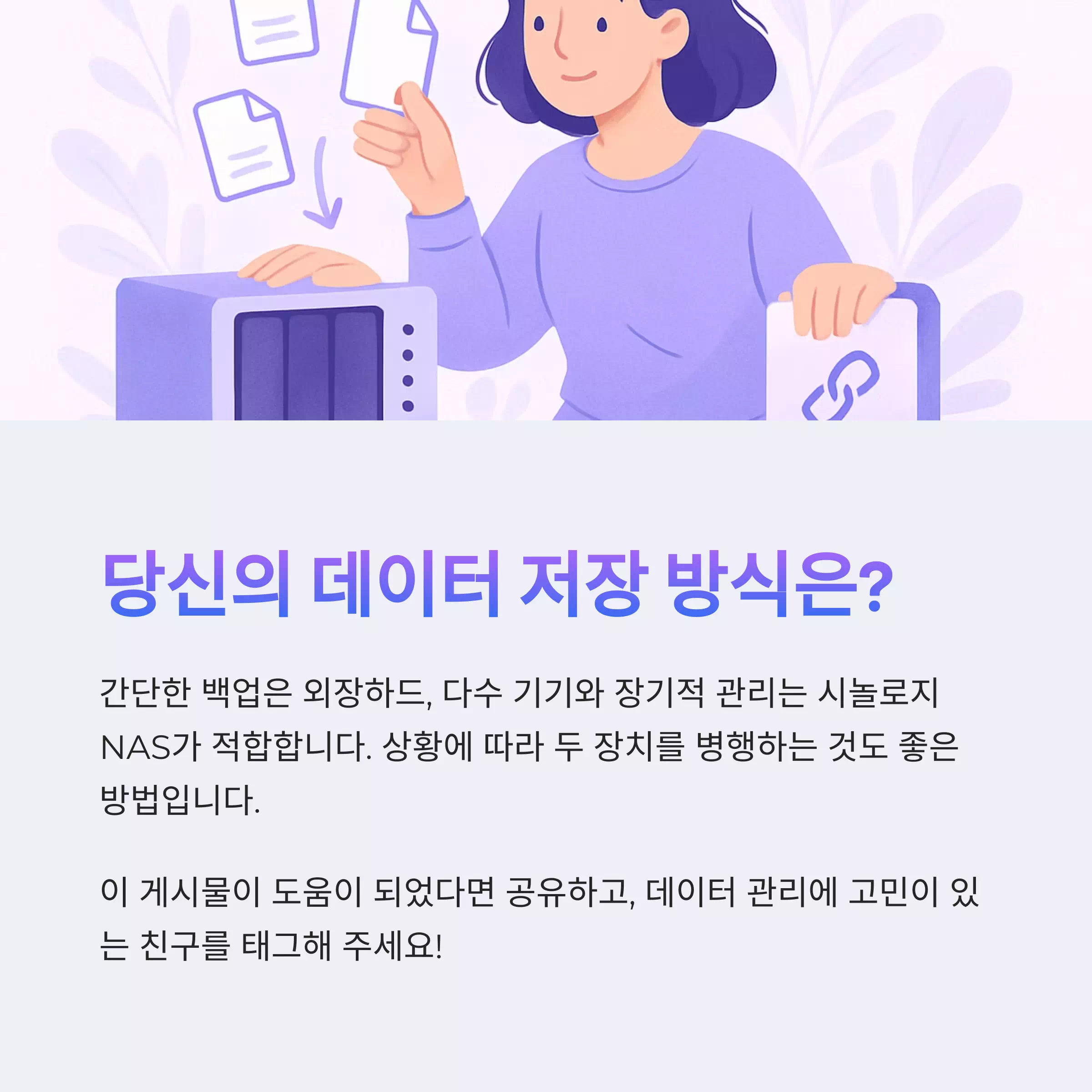 데이터가 점점 늘어나는 시대, 사진과 영상, 업무 파일부터 개인적인 기록까지 안전하게 저장하려면 저장 매체 선택이 중요합니다. 특히 시놀로지 NAS와 외장하드는 각기 다른 장점과 한계를 지니고 있어 고민이 생길 수밖에 없습니다. 이번 글에서는 두 가지 저장 장치를 비교하며 어떤 상황에서 어떤 장비가 더 적합한지 구체적으로 살펴보겠습니다.
