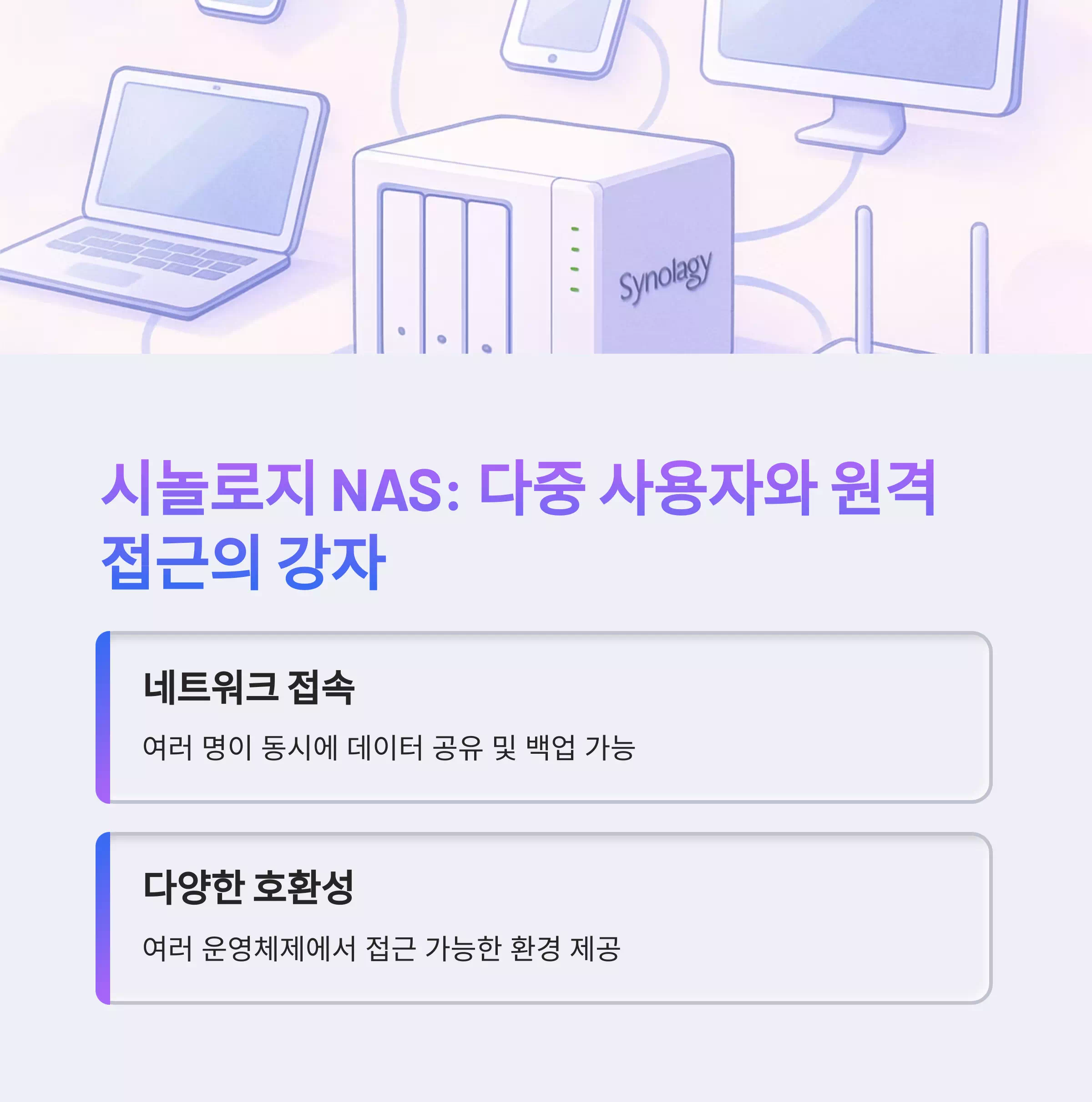 시놀로지 NAS는 네트워크를 통해 접속이 가능하며, 여러 명이 동시에 데이터를