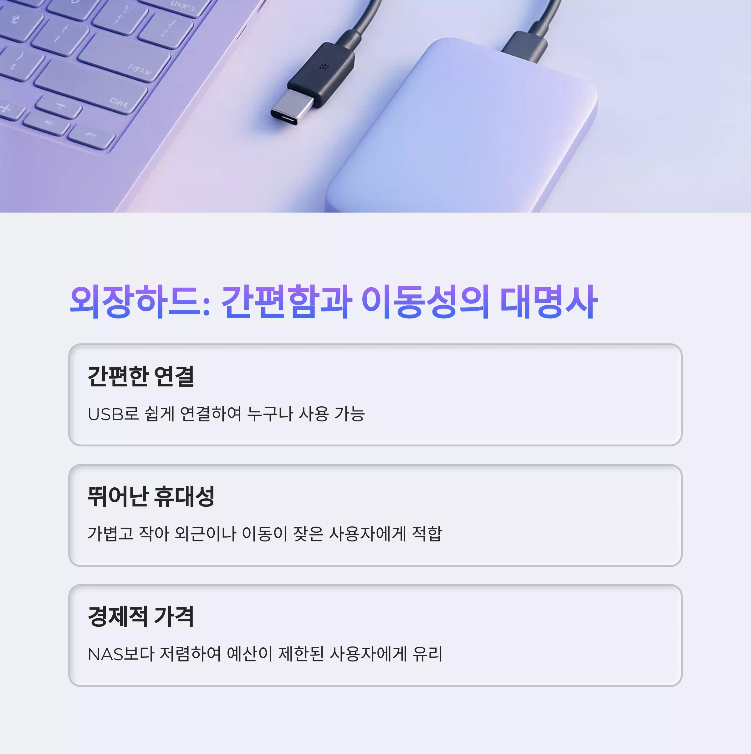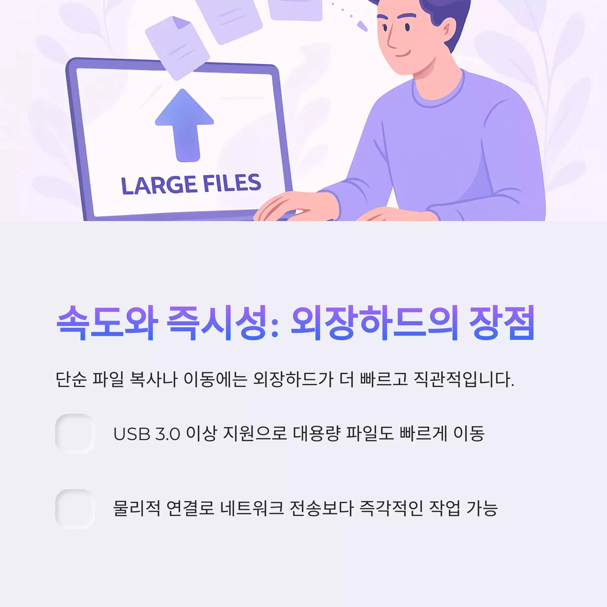 단순한 파일 복사나 이동 목적이라면 외장하드가 훨씬 빠르고 직관적입니다.