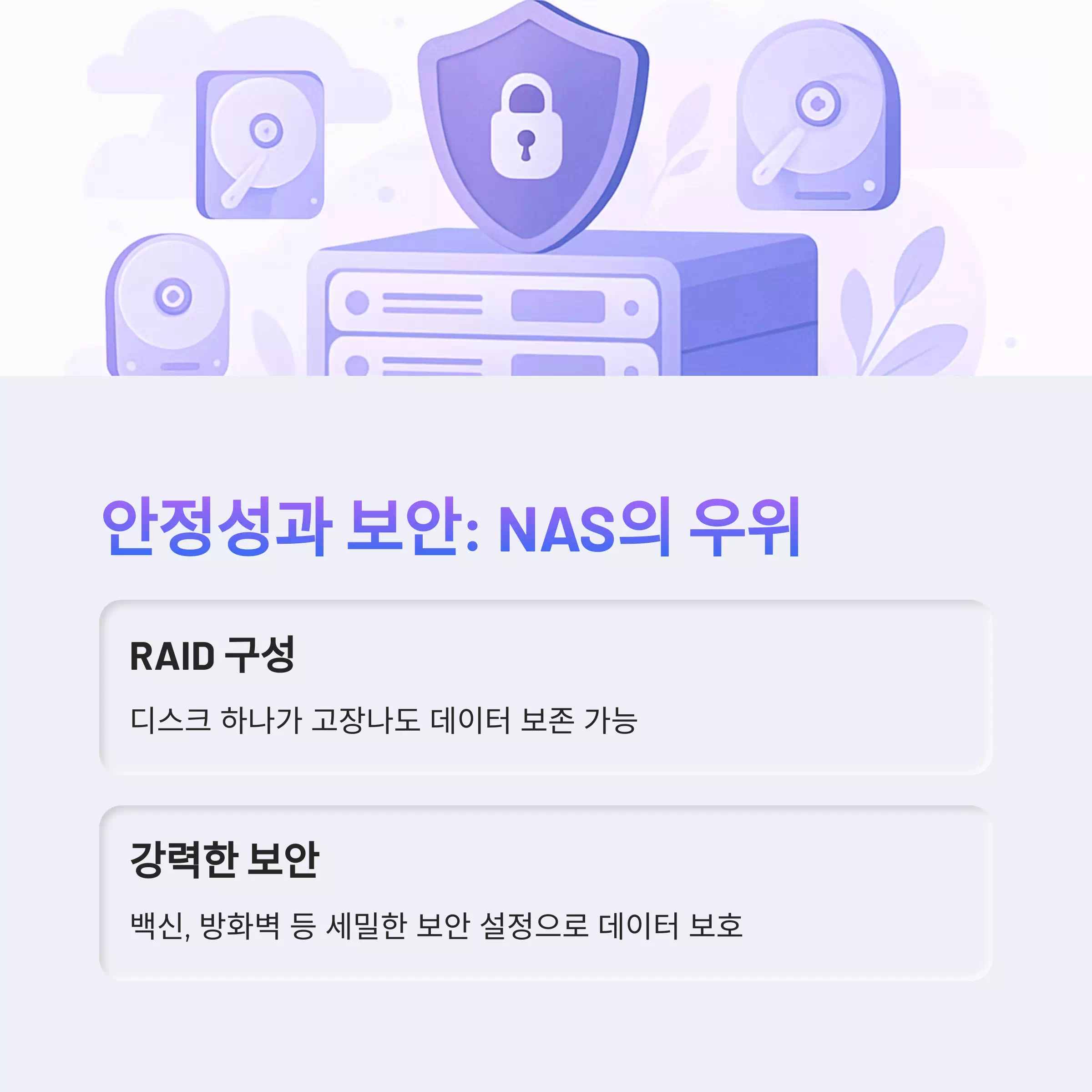 저장 안정성과 보안 측면에서는 NAS가 우위입니다
