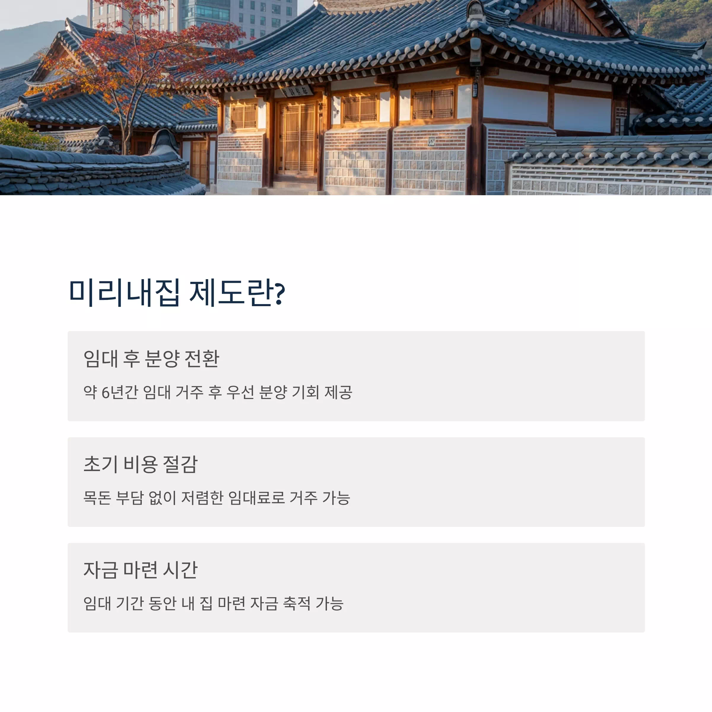 - 자금 마련 시간 확보 : 임대 기간 동안 저렴한 임대료로 거주하면서 자금을 모을 수 있음