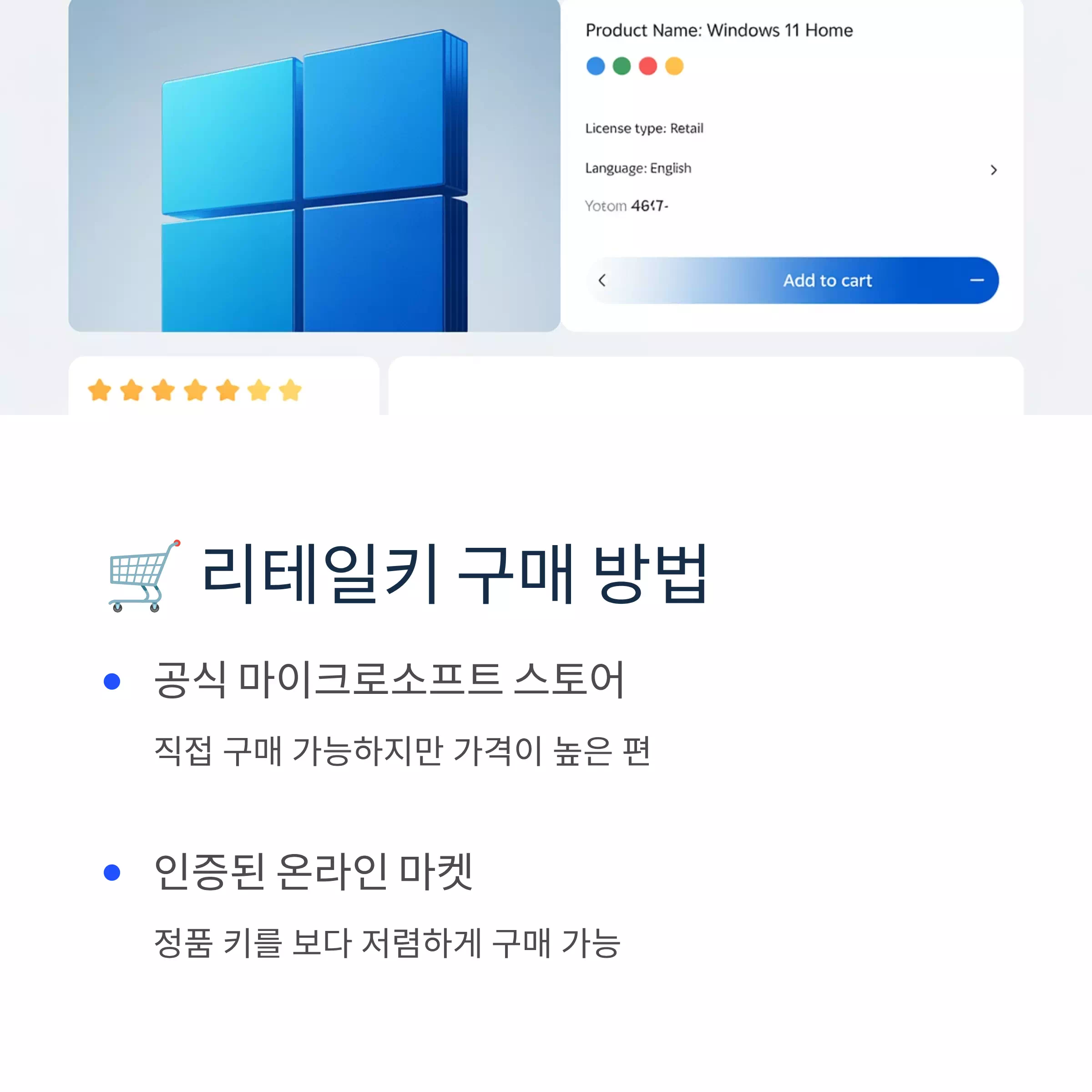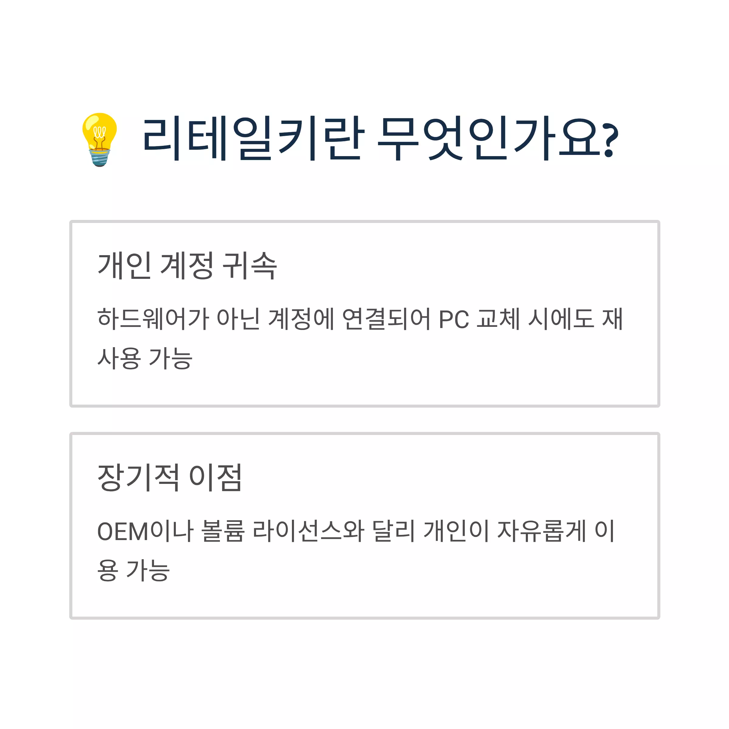 리테일키(Retail Key)는 정식 유통 채널을 통해 개인이 구매할 수 있는 윈도우 라이선스 제품 키입니다.