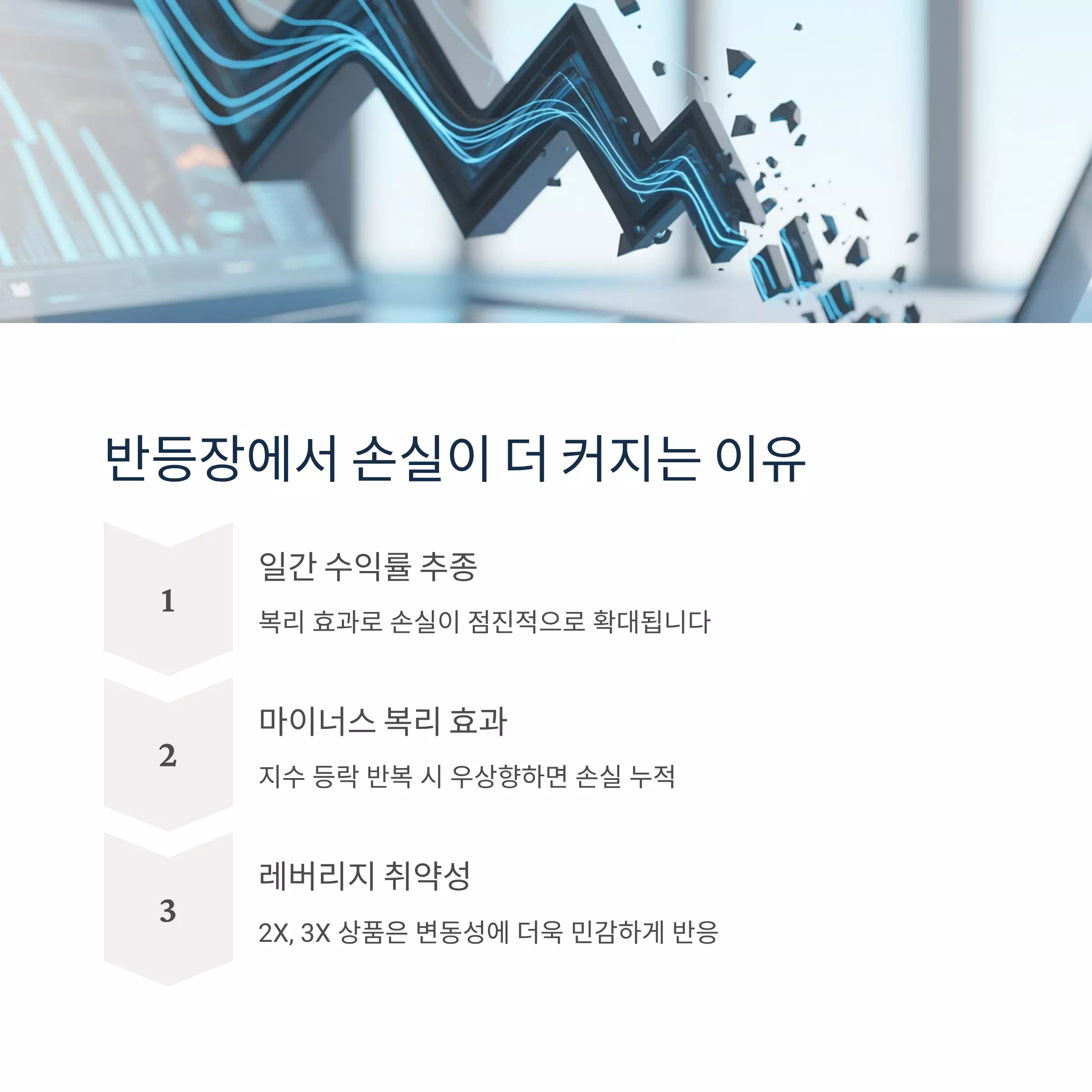 - 일간 수익률 추종 구조 → 복리 효과로 손실 확대
