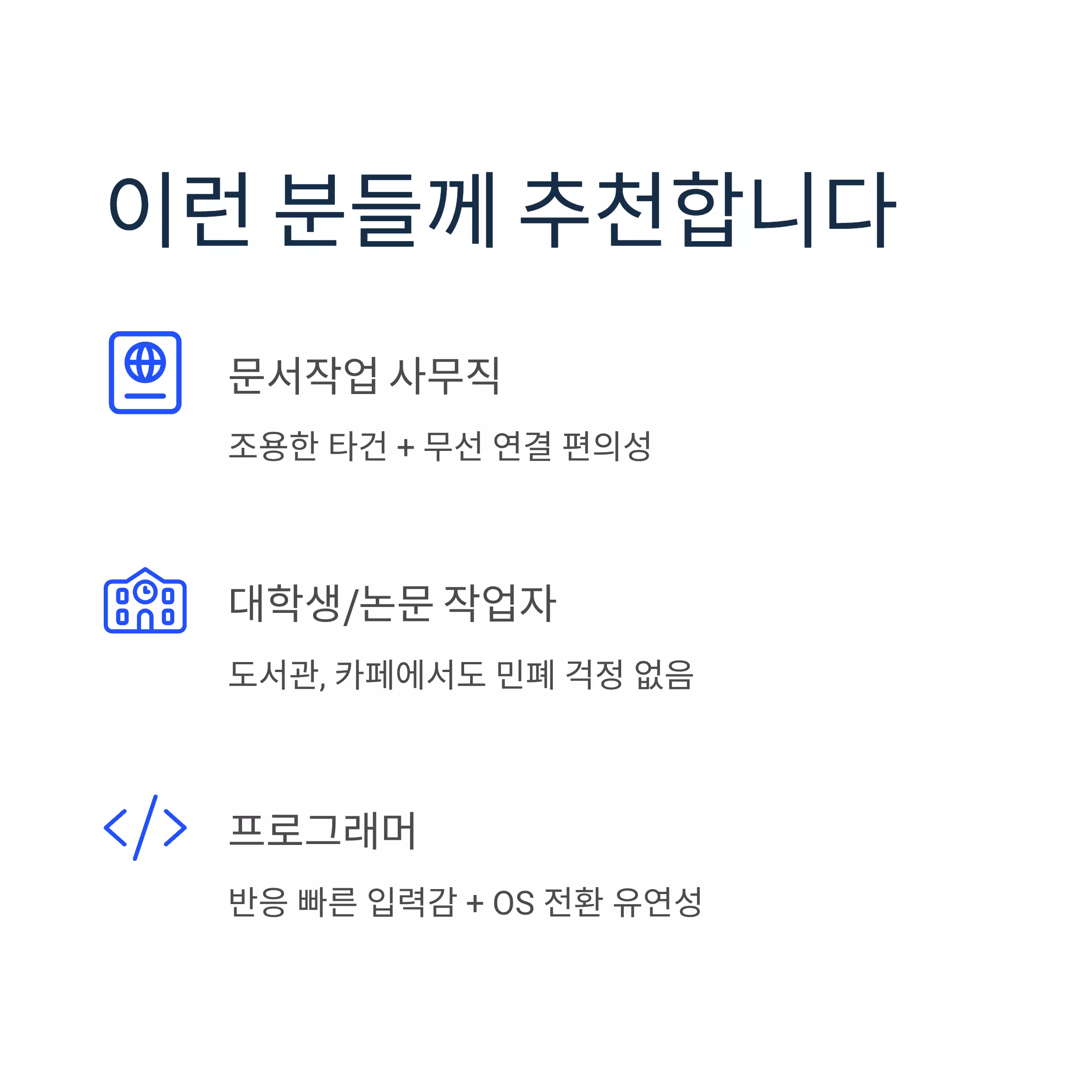 | 👨💻 문서작업 중심 사무직 | 조용한 타건 + 무선 연결 편의성 |