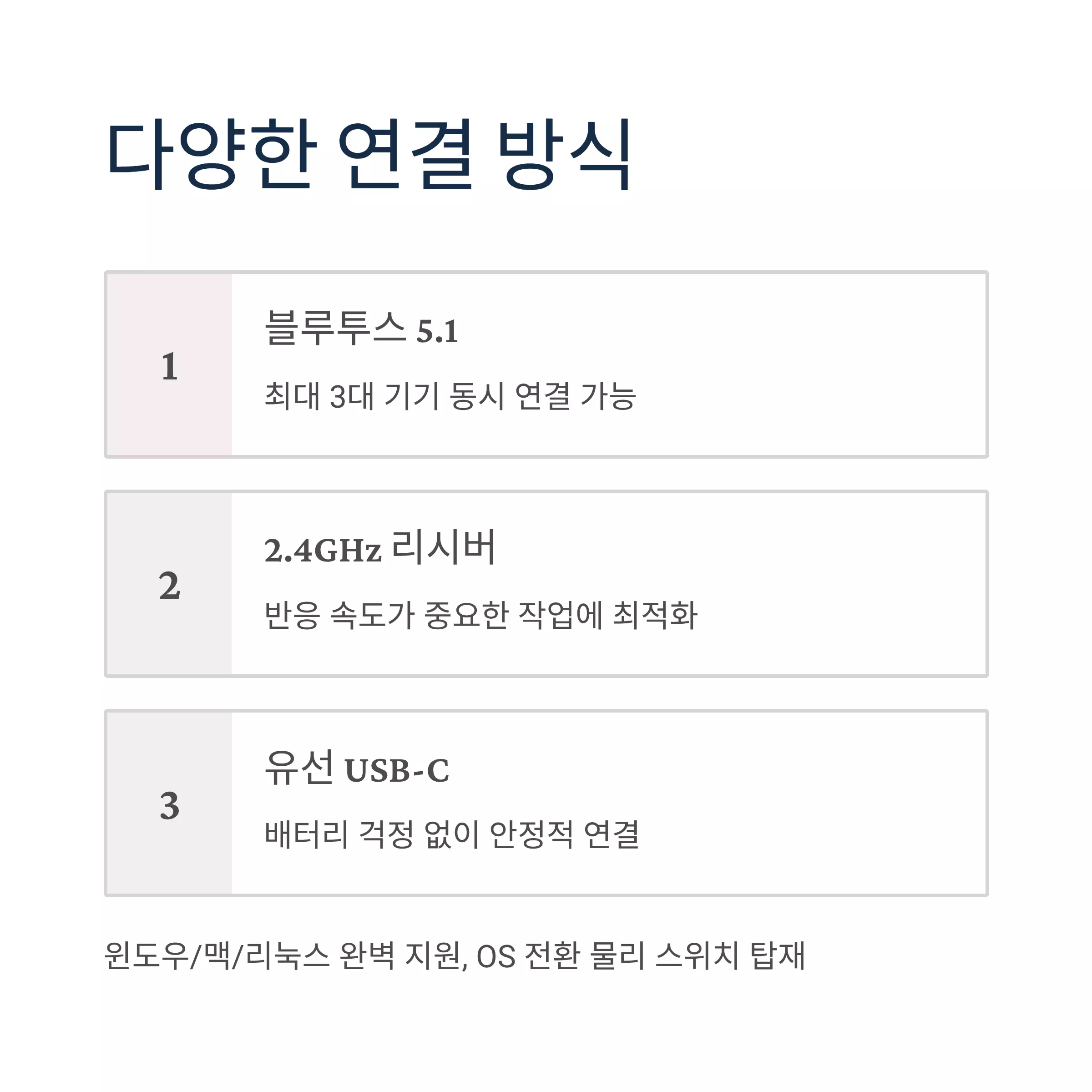 | 연결 방식 | Bluetooth 5.1 / 2.4GHz / USB-C |