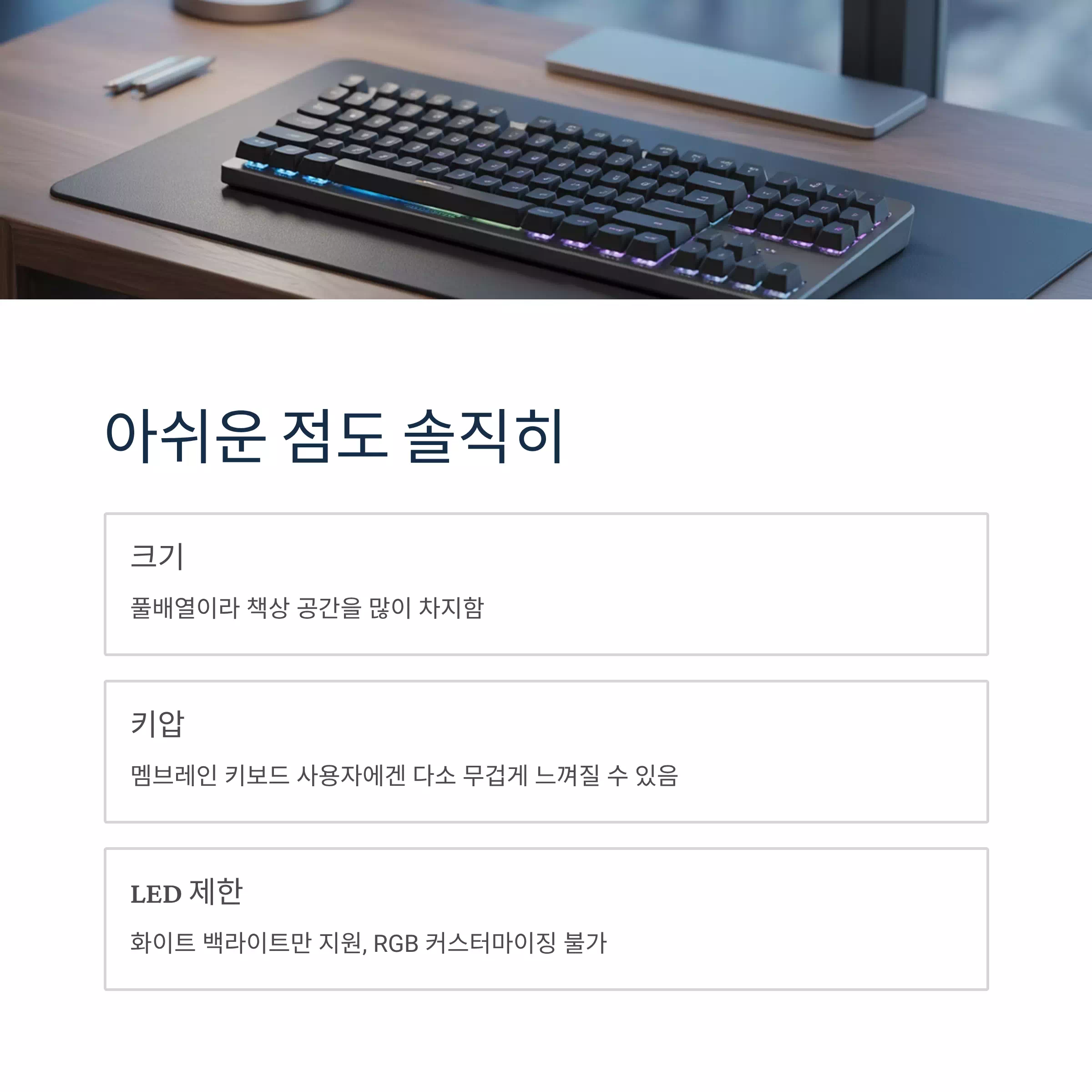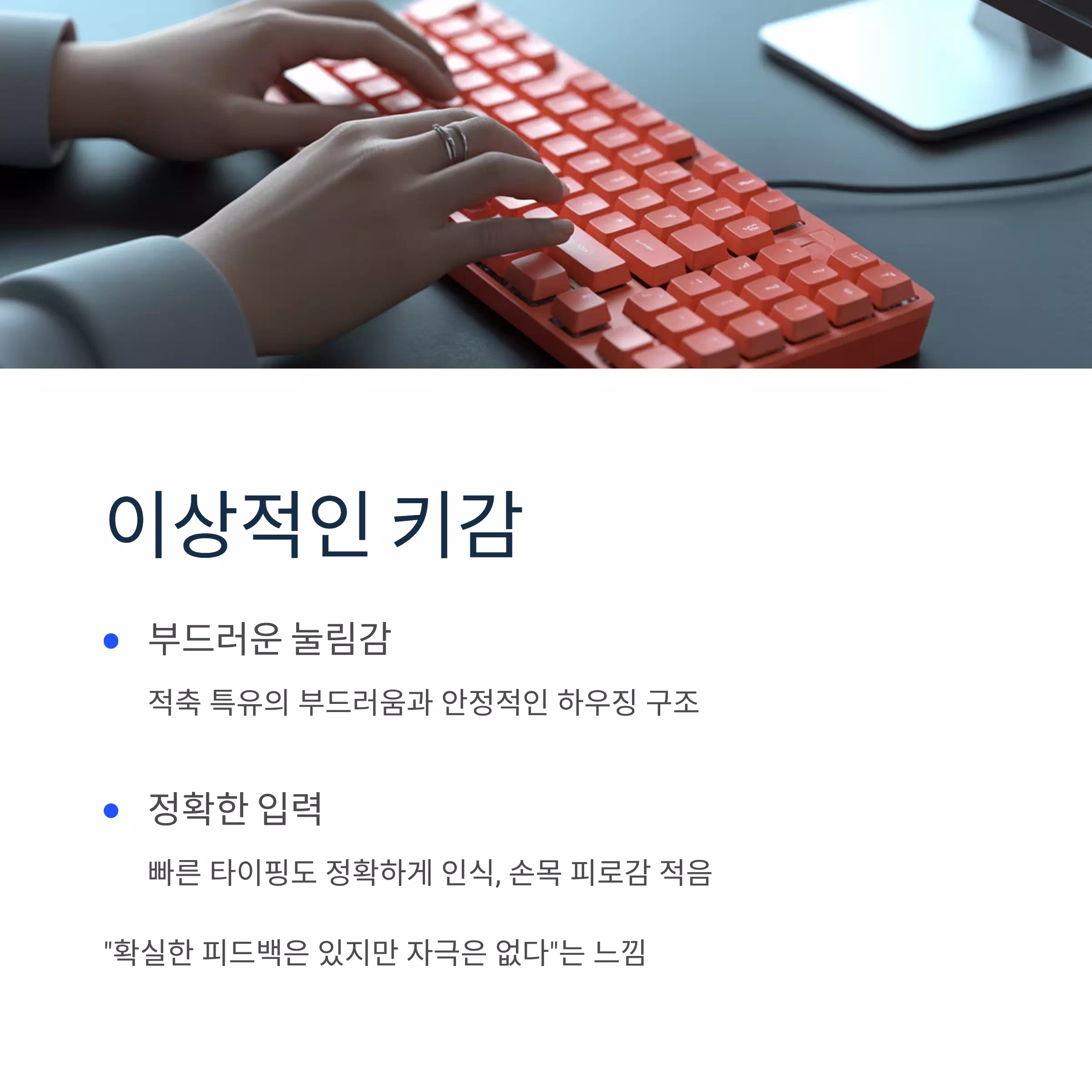 단, 게이밍용이나 극한 타건감을 원하는 분에겐 다소 아쉬울 수 있음.