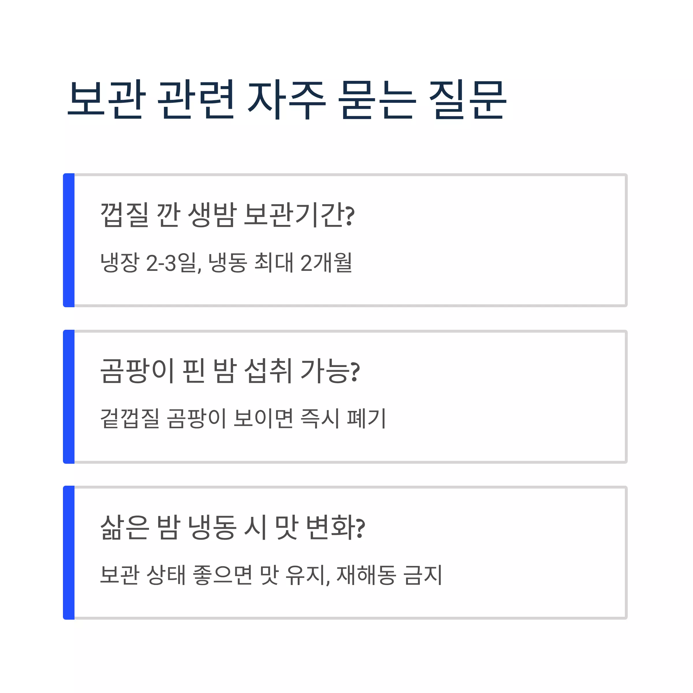 | 생밤 통째 냉동 | 껍질째 바로 냉동 | 약 3개월 | 해동 후 껍질 벗기기 쉬움 |