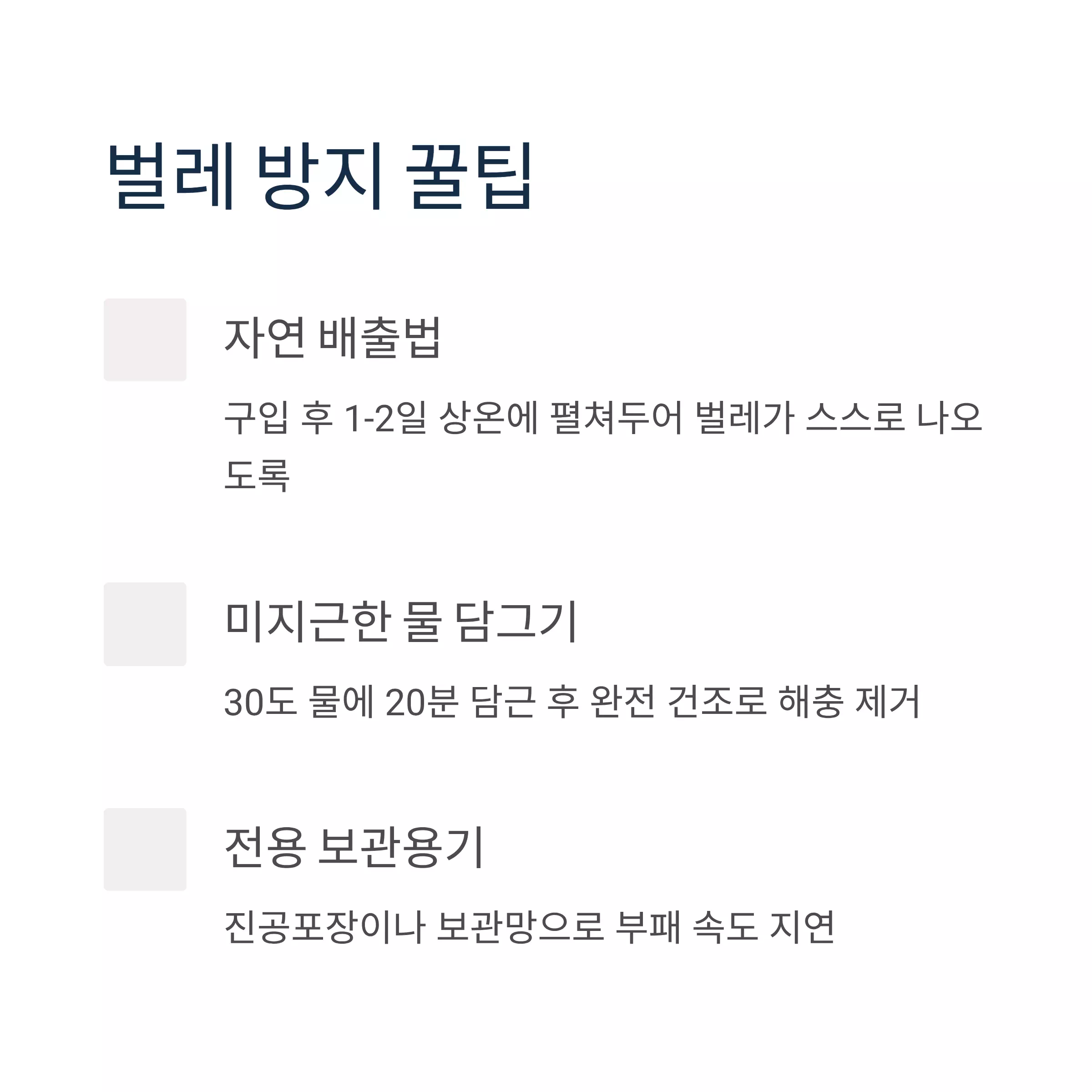 - 구입 후 1~2일 상온에 펼쳐두기 → 벌레가 스스로 나오도록