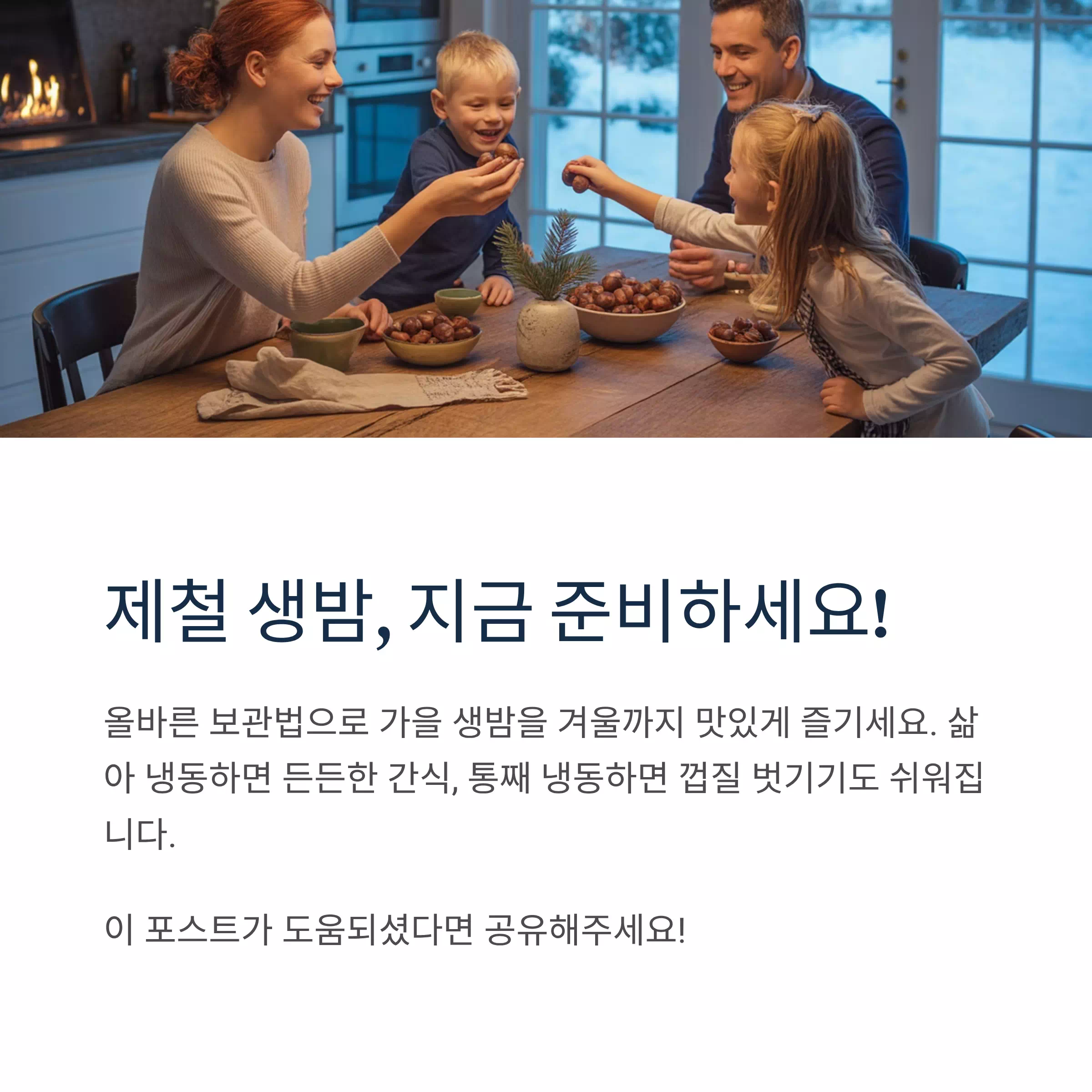 밤은 보관만 잘하면 가을에 사두고 겨울까지 충분히 즐길 수 있는 제철 간식입니다.