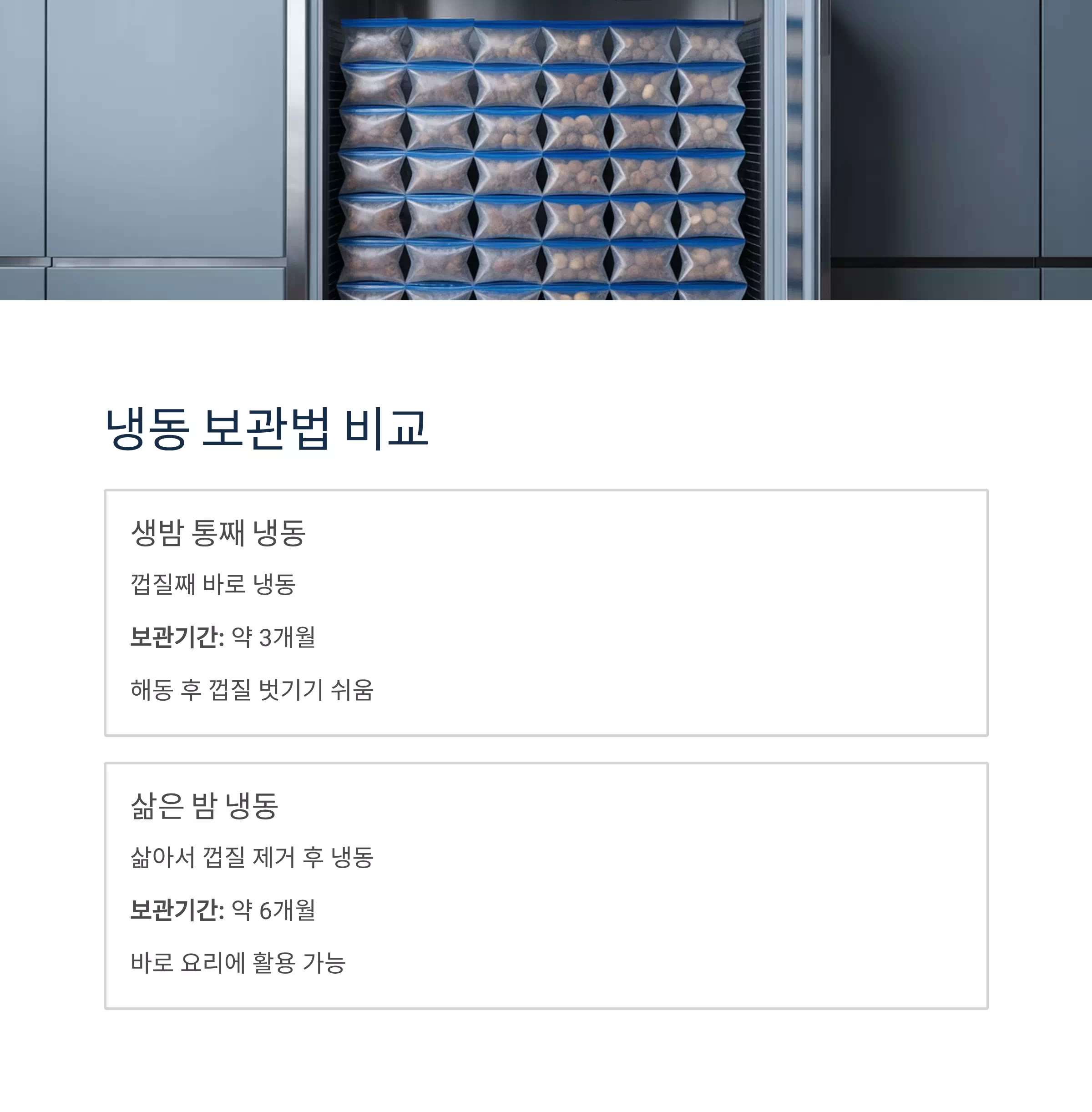 | 삶은 밤 냉동 | 삶은 후 껍질 제거 후 냉동 | 약 6개월 | 바로 요리에 활용 가능 |