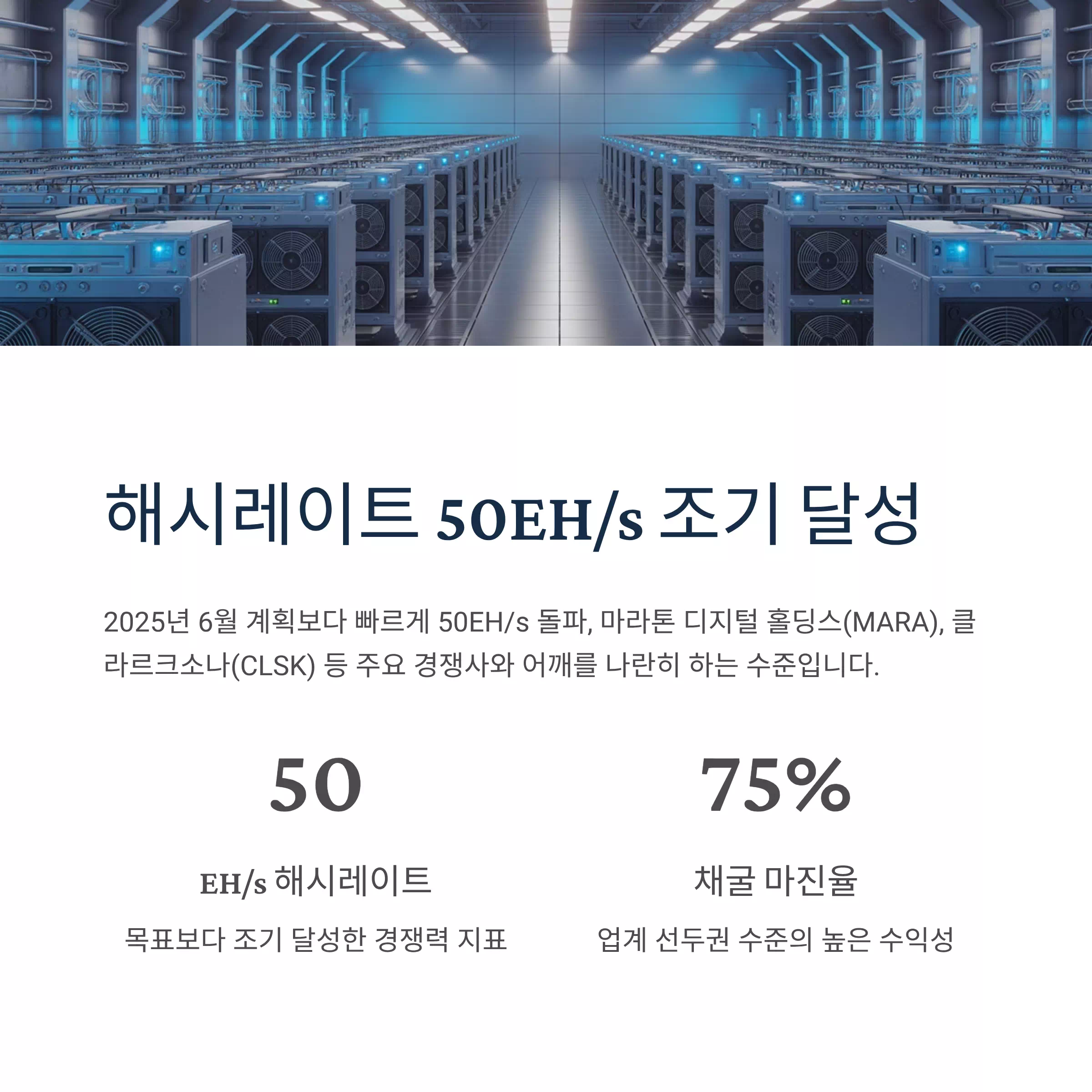 아이렌의 중요한 경쟁력 지표인 해시레이트는 2025년 6월 계획 대비 조기에 50EH/s를 돌파했습니다. 이는 마라톤 디지털 홀딩스(MARA), 클라르크소나(클리스크) 등 주요 경쟁사들과 어깨를 나란히 하는 수준으로, 투자자 신뢰에 긍정적 영향을 끼쳤습니다.