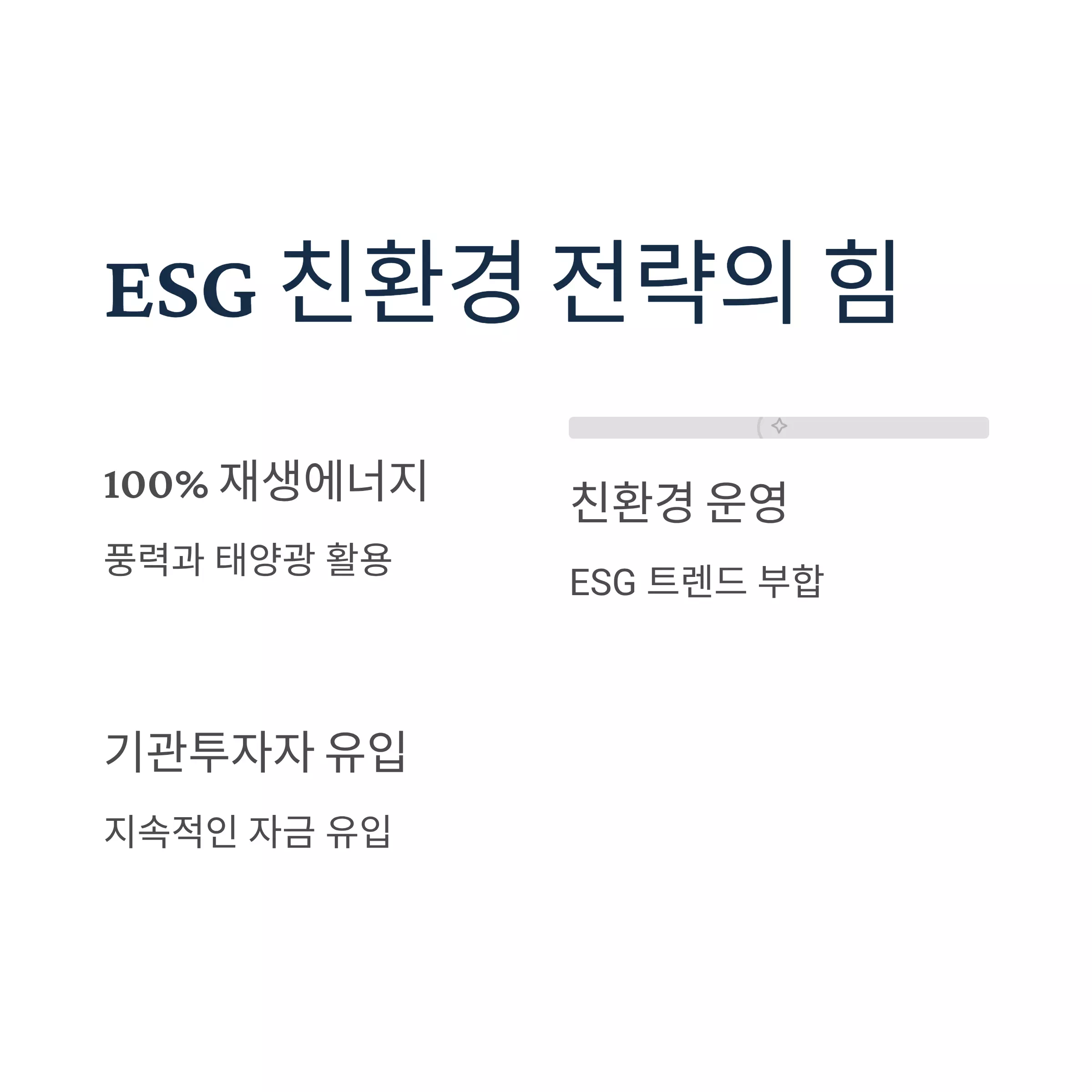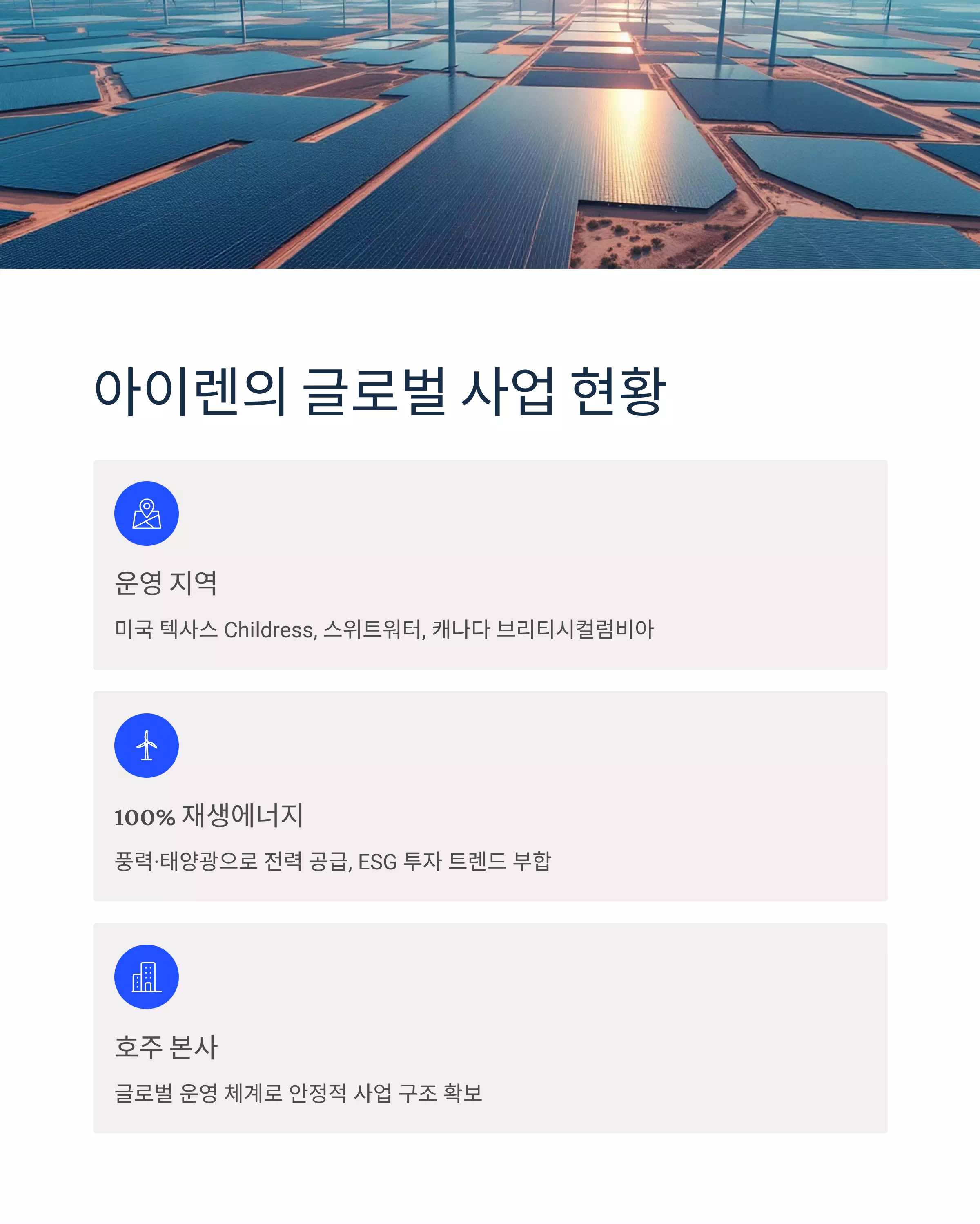 아이렌은 100% 재생에너지(주로 풍력과 태양광)를 활용, ESG 트렌드에 부합하는 친환경 채굴 및 데이터센터 운영 기업으로 평가받아 기관투자자 자금 유입이 지속되고 있습니다.