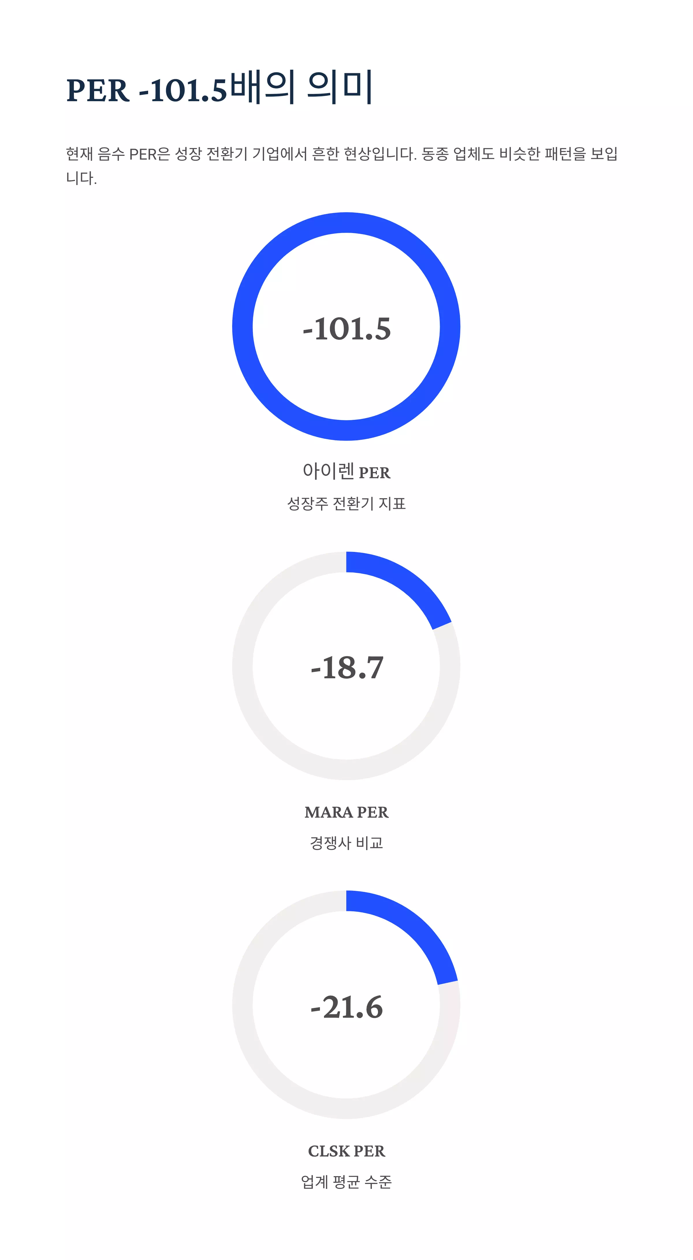 2025년 2분기 흑자 전환했음에도, 현재 아이렌의 PER은 -101.5배로 표시되지만 이는 성장 전환기 기업에서 흔히 보이는 현상입니다. 동종 업체인 MARA(-18.7), CLSK(-21.6)도 비슷한 음수 PER을 기록 중입니다.