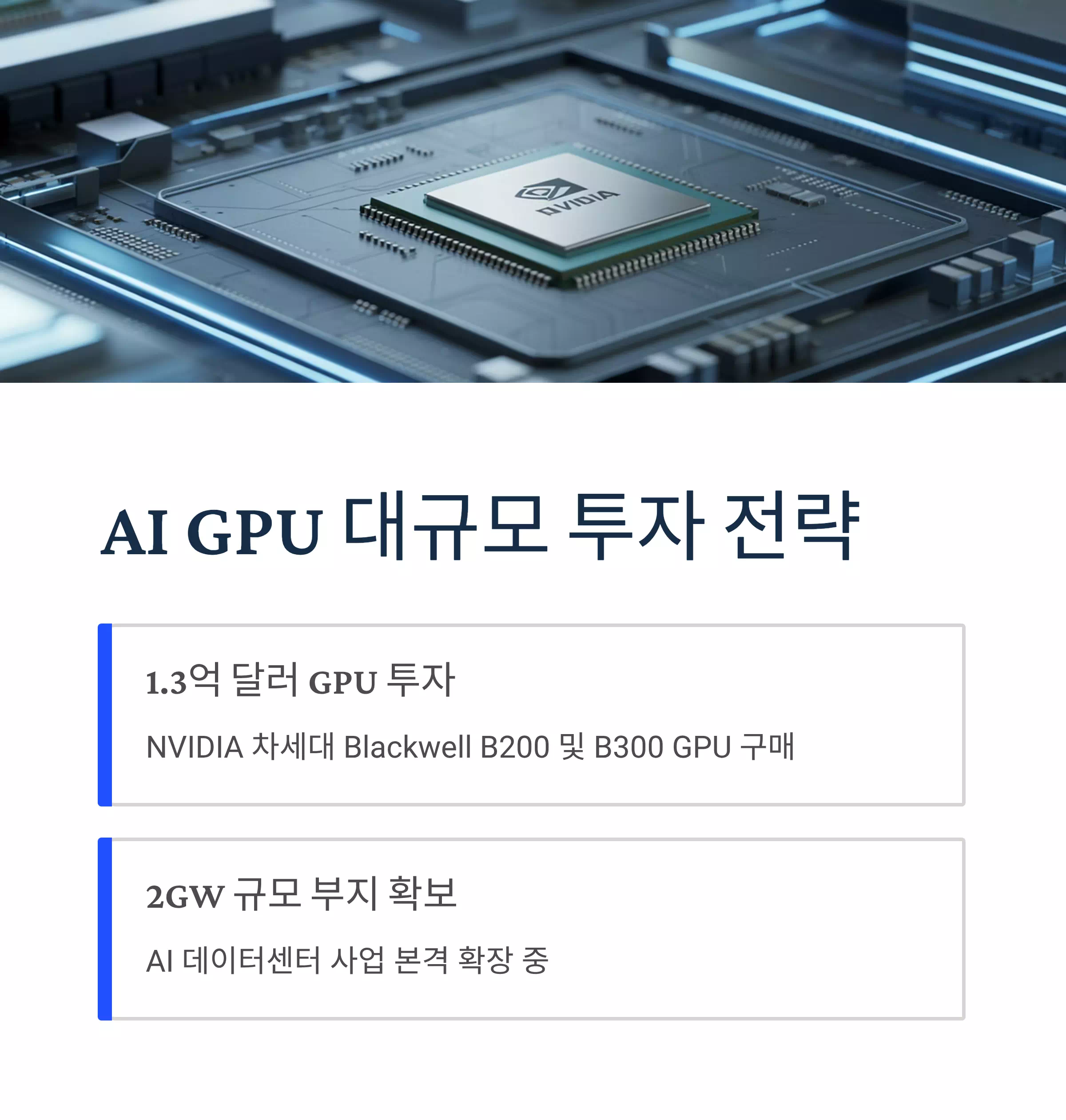 채굴에만 집중하는 기업이라면 대규모 GPU 투자와 AI 인프라 확장은 무의미하겠지만, 아이렌은 다릅니다. 약 1.3억 달러를 NVIDIA 차세대 Blackwell B200 및 B300 GPU 구매에 투입했고, 2GW 규모 부지 확보로 AI 데이터센터 사업 본격 확장 중입니다.