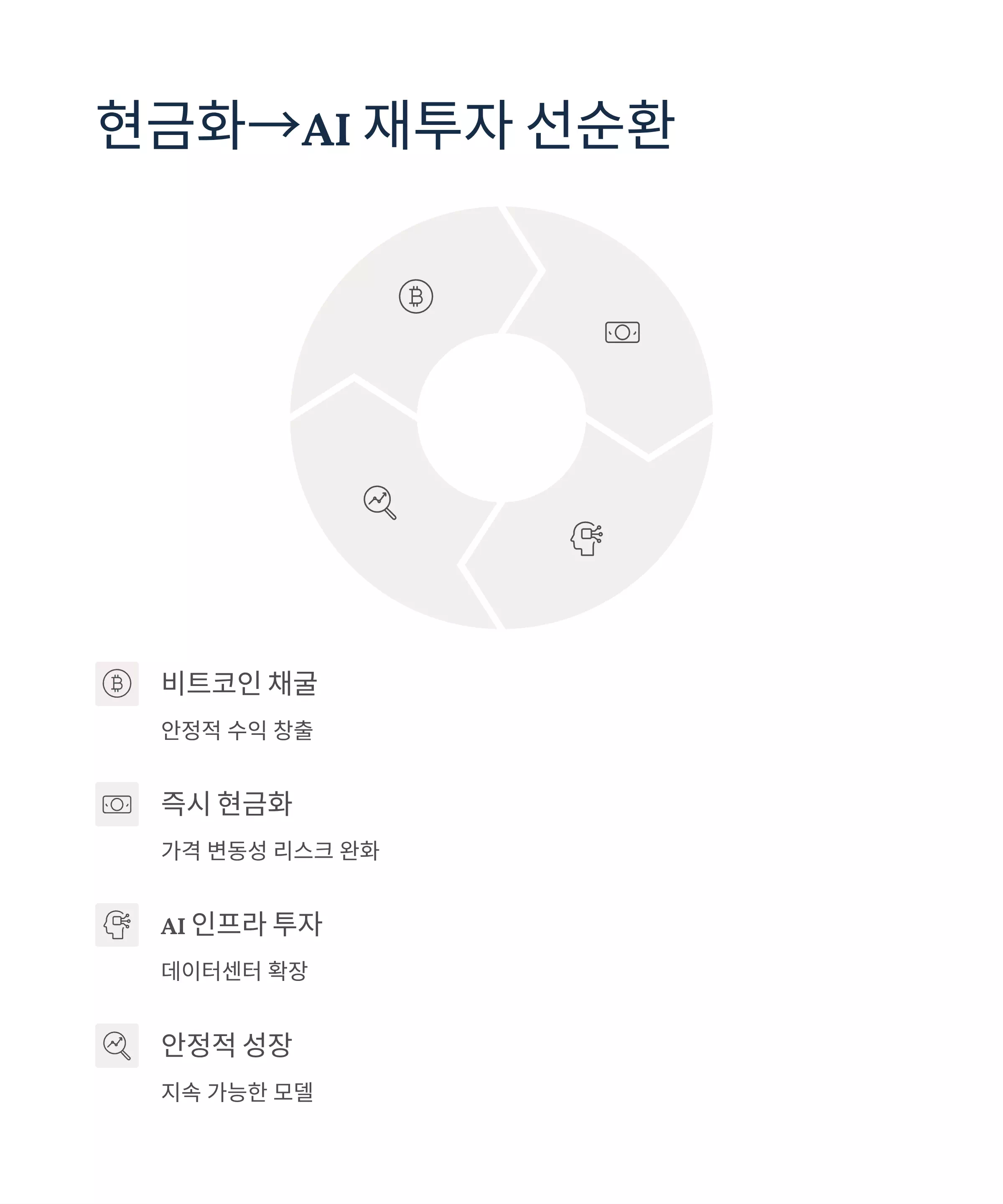 아이렌은 비트코인 채굴 수익을 즉시 현금화해 AI 데이터센터 인프라에 돌려 투자하는 선순환 구조를 갖췄습니다. 이로 인해 비트코인 가격 변동성 리스크는 완화되고, 안정적인 현금흐름과 성장투자가 동시 가능해 시장에서 높은 평가를 받고 있습니다. 채굴 마진율도 약 75%로 업계 선두권입니다.