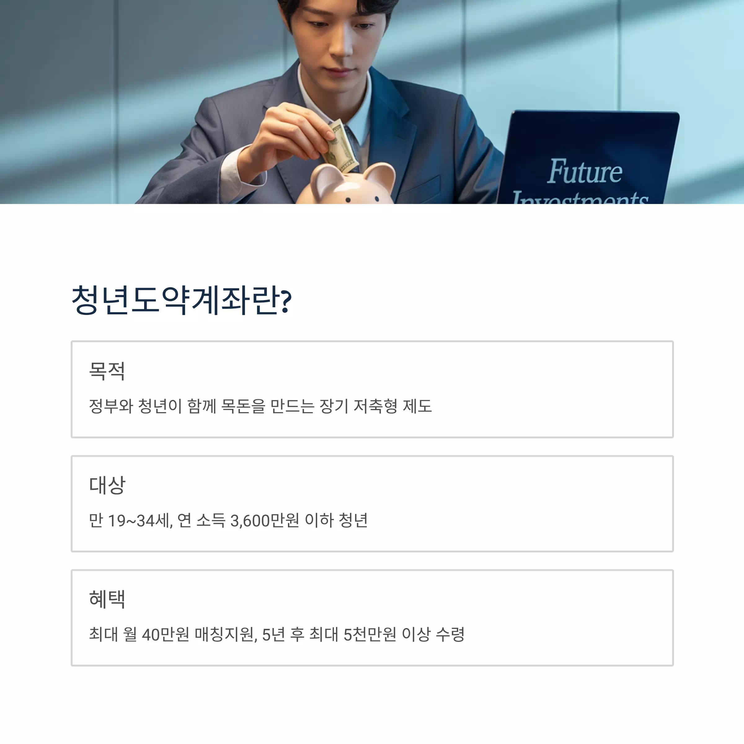 청년도약계좌는 정부와 청년이 함께 목돈을 만드는 장기 저축형 제도입니다.