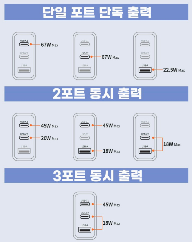 그리고 기본 구성품으로 제공되는 어댑터에는 총 두 개의 포트로 나눠져 있는데요.