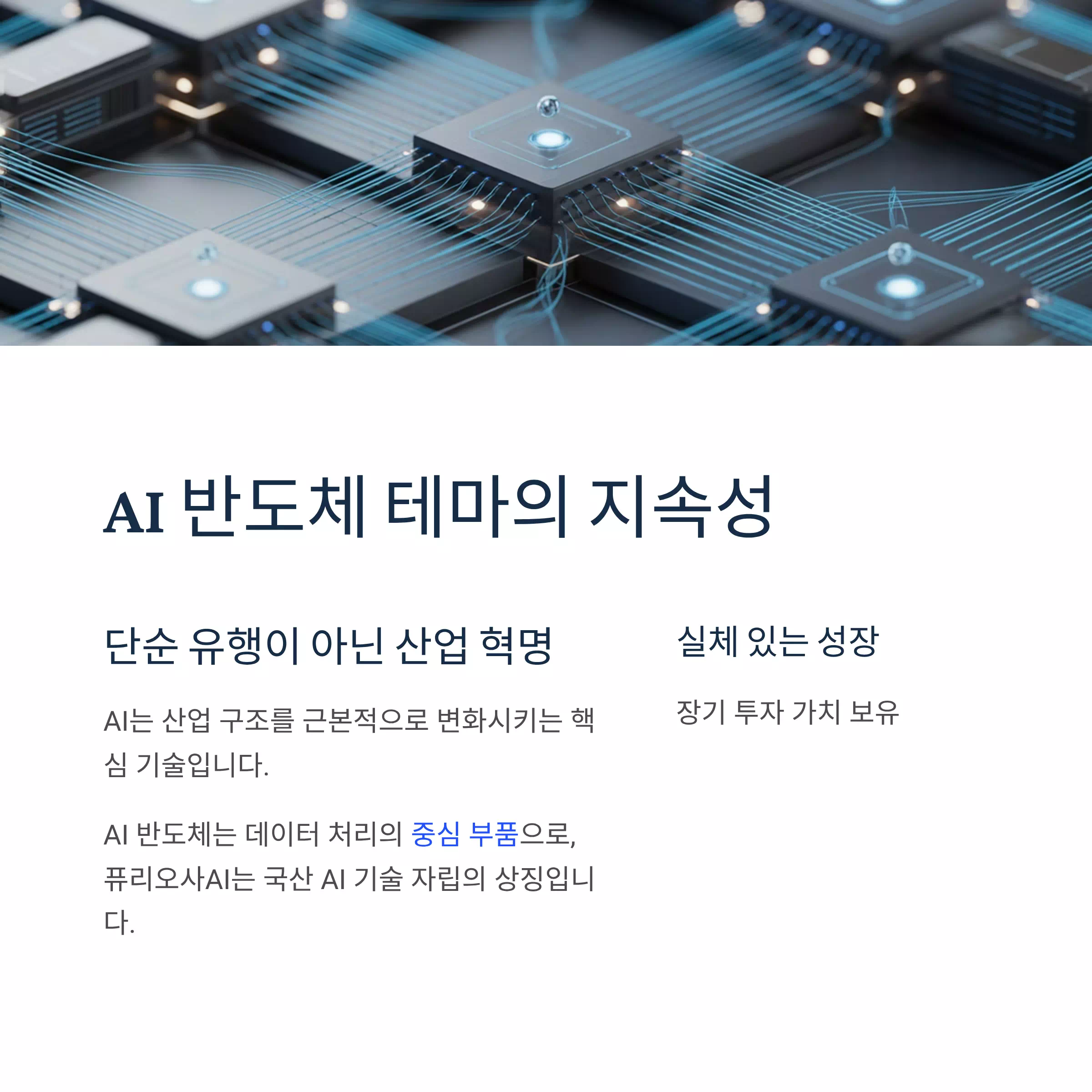 AI는 단순한 유행이 아니라 산업 구조를 근본적으로 바꾸는 기술입니다. AI 반도체는 그 중심에서 데이터 처리의 핵심 부품 역할을 수행하며, 퓨리오사AI는 국산 AI 기술 자립의 상징으로 주목받고 있습니다. 즉, 실체 있는 성장 산업이라는 점이 중요합니다.