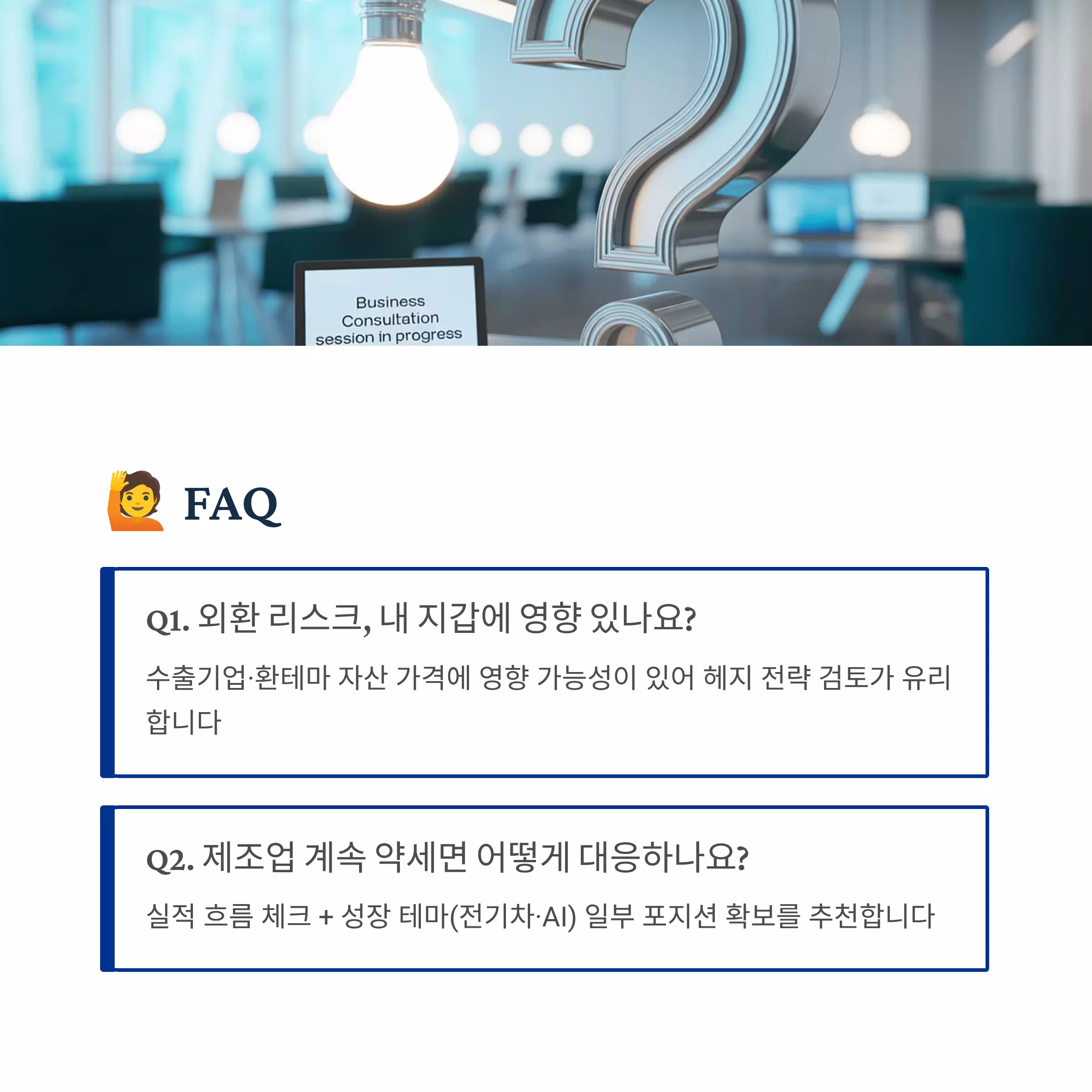 - 기업 리스크 체크: 무역•외교 변수에 민감한 종목은 비중 조절.