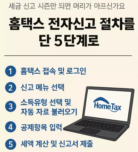하지만 걱정 마세요! 이 글에서는 **홈택스 전자신고 절차를 단 5단계로** 깔끔하게 정리해드릴게요. 따라만 하시면 세무서 가지 않고도 신고 끝낼 수 있어요. 💻