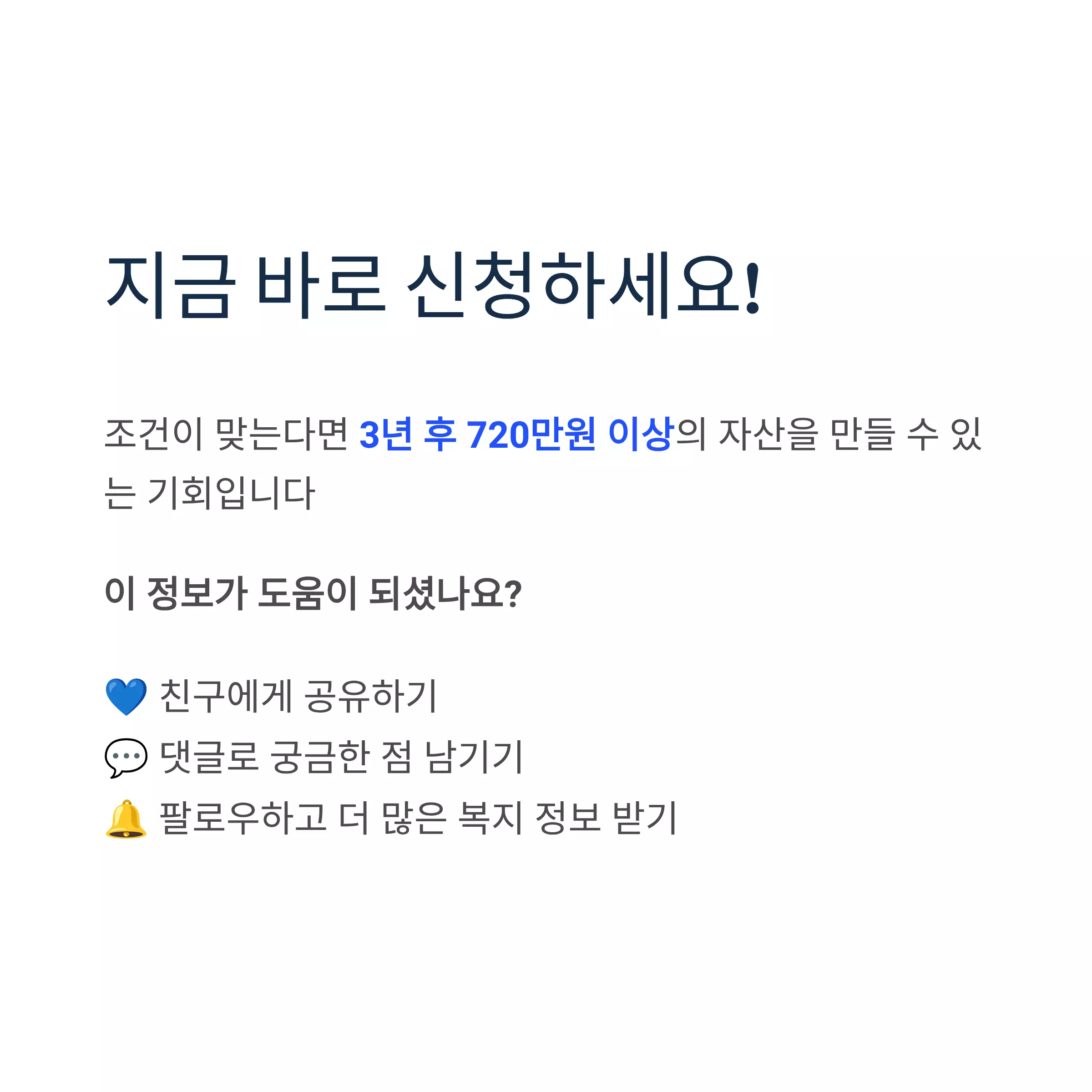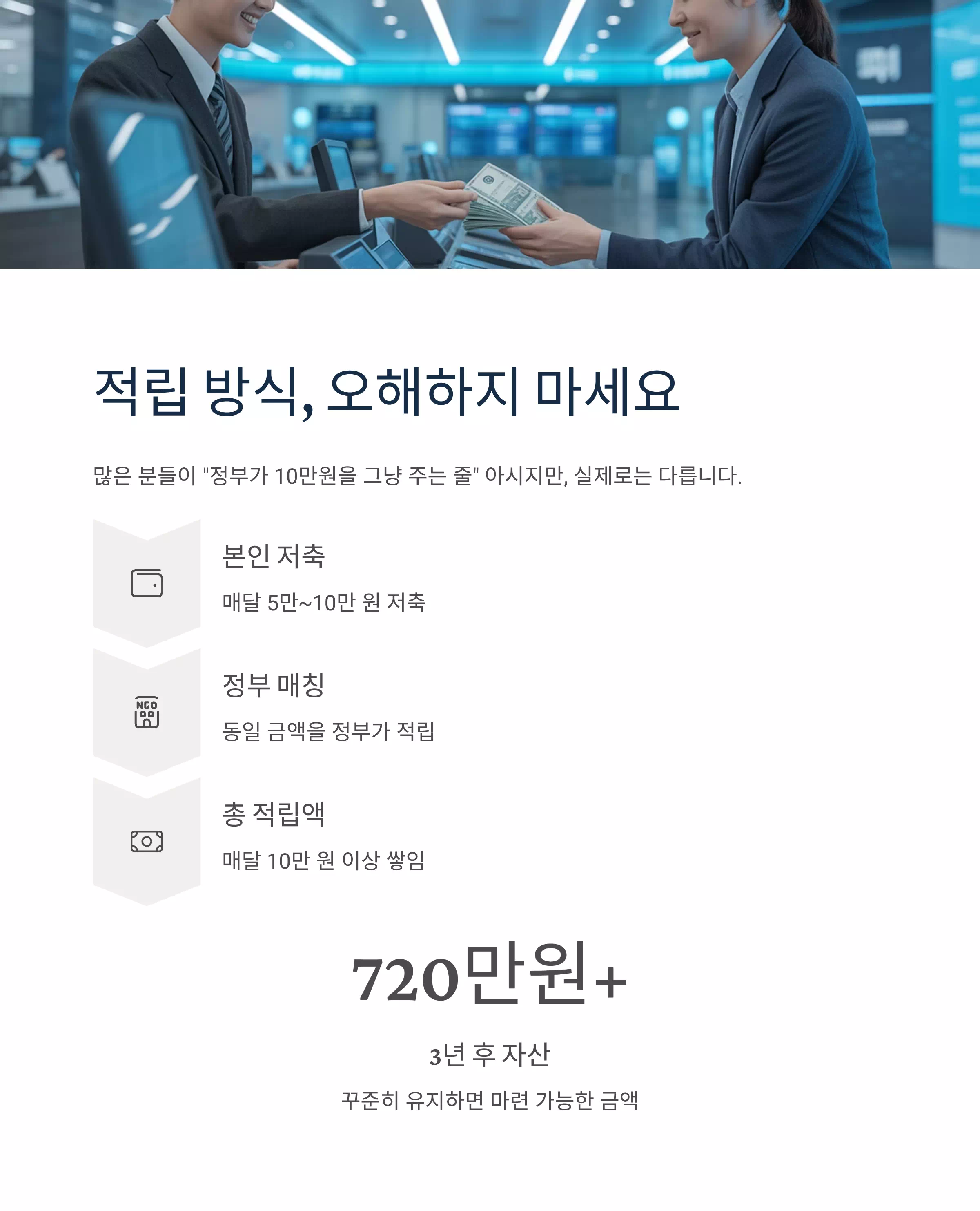 즉, 본인 저축 + 정부지원금으로 매달 총 10만 원 이상이 쌓이게 됩니다. 3년간 유지하면 약 720만 원 이상의 자산을 마련할 수 있어요.