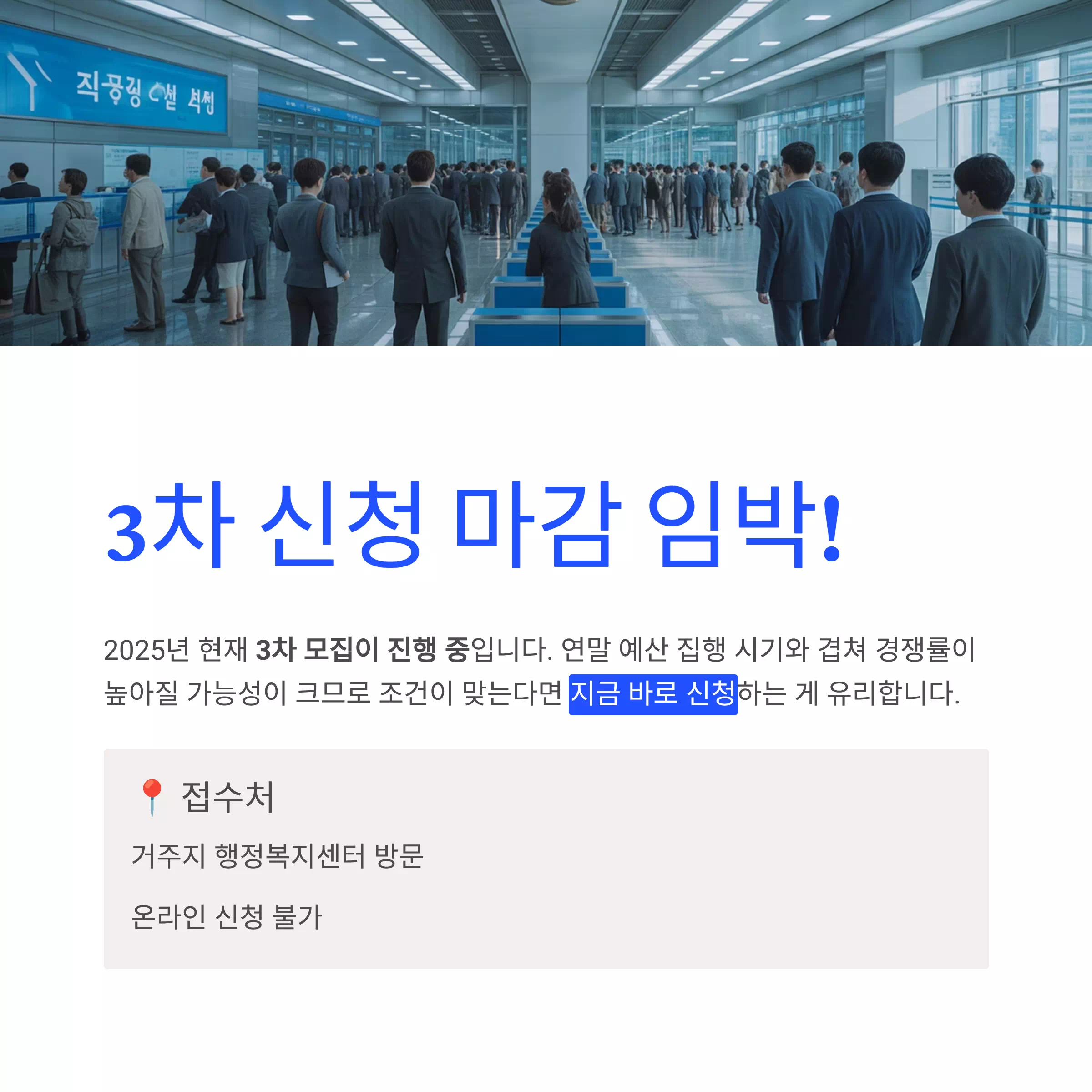 2025년 현재 3차 모집이 진행 중입니다. 연말 예산 집행 시기와 겹쳐 경쟁률이 높아질 가능성이 크므로 조건이 맞는다면 지금 바로 신청하는 게 유리합니다.