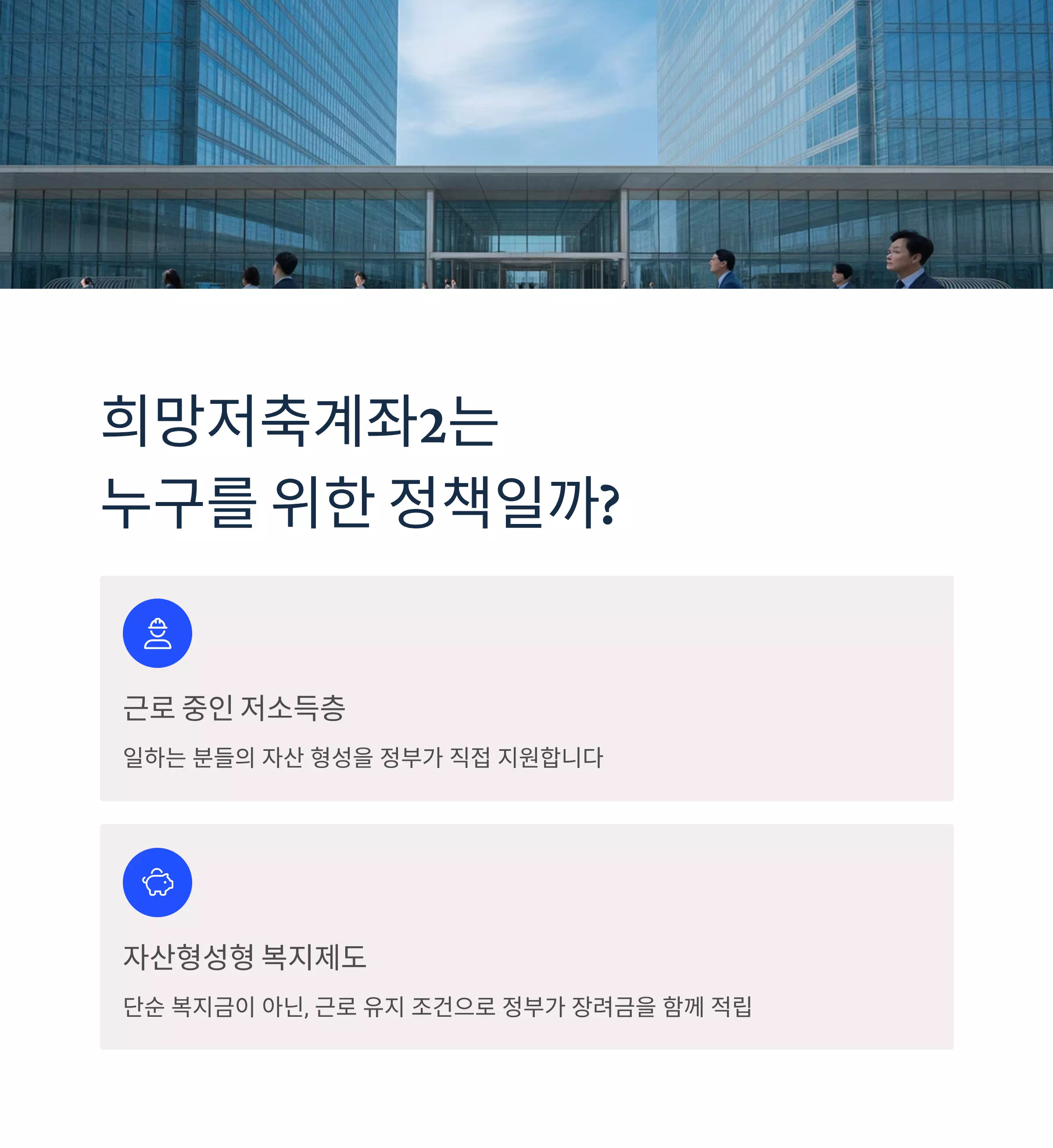 정부는 근로 중인 저소득층의 자산 형성을 지원하기 위해 희망저축계좌2 제도를 운영합니다. 단순 복지금이 아닌, 근로를 유지하는 조건으로 정부가 장려금을 함께 적립해주는 자산형성형 복지제도입니다.