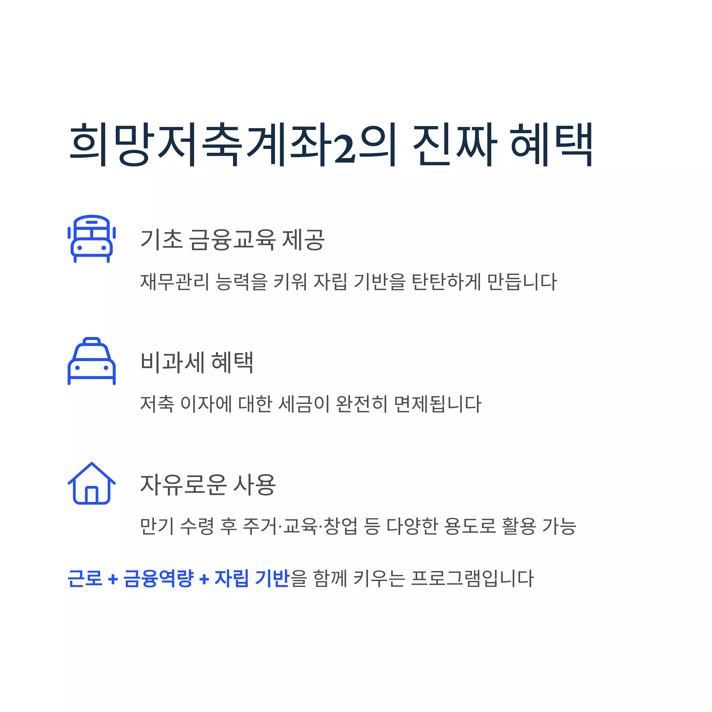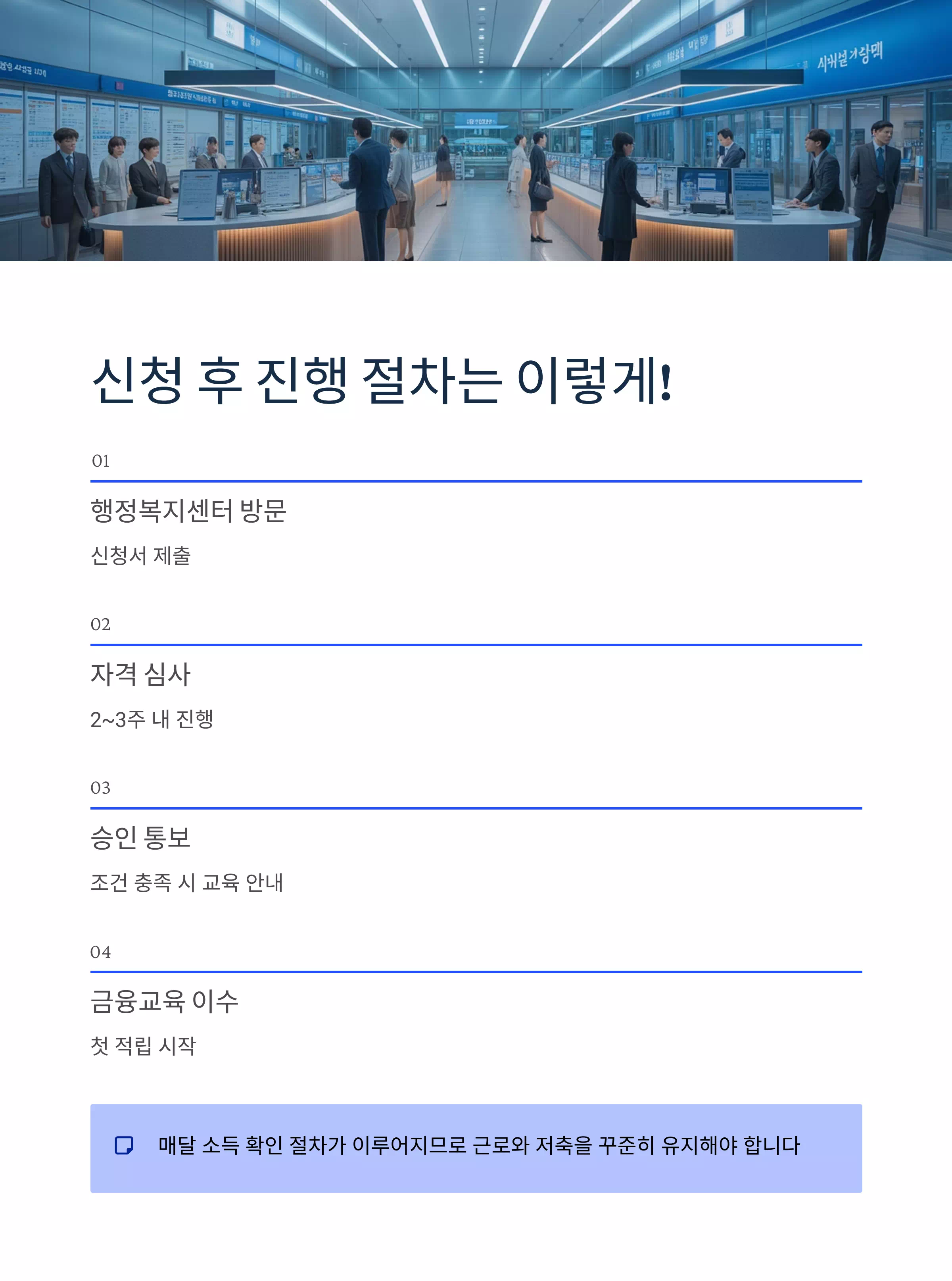 - 💡 자유로운 사용 — 만기 수령 후 주거·교육·창업 등 다양한 용도로 활용 가능
