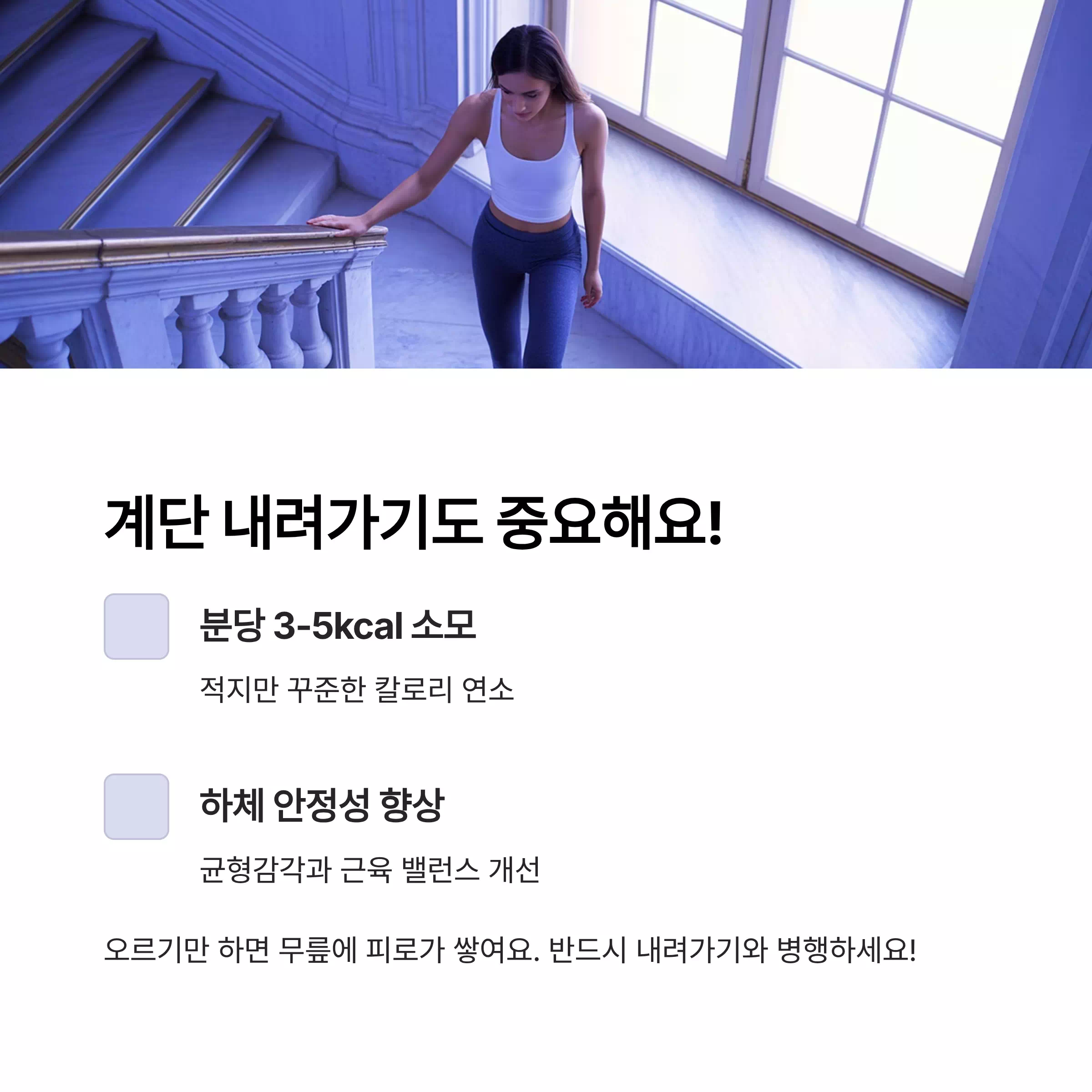계단 내려가기는 칼로리 소모가 적다고 무시하면 안 됩니다. 1분에 약 3~5kcal를 태우며, 하체 안정성·균형감각을 높여주는 데 아주 중요해요. 특히 오르기만 하면 무릎 피로가 쌓일 수 있으므로 반드시 내려가기와 병행하는 걸 추천합니다.