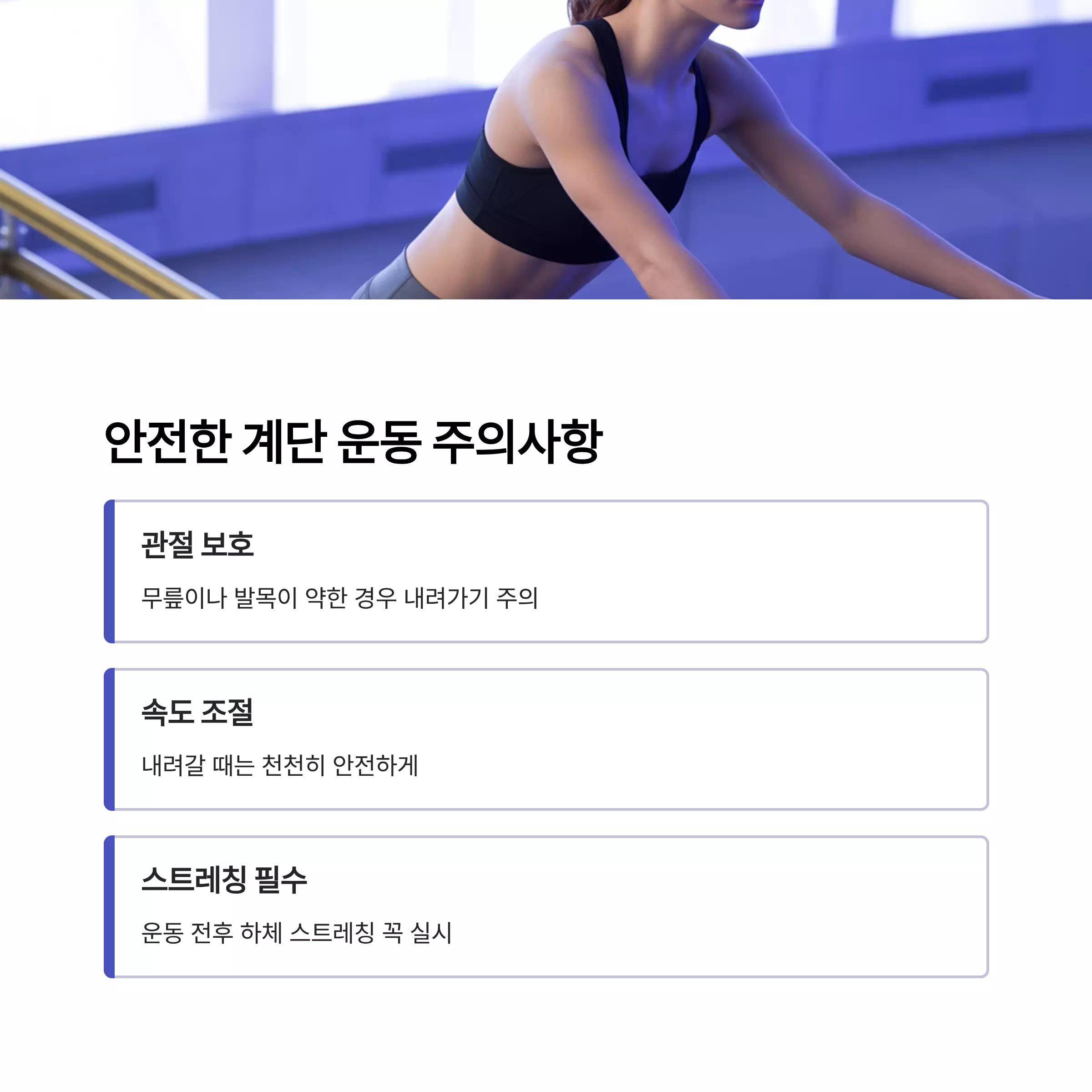 - 내려갈 때는 빠르게 뛰지 말고 천천히 디디는 것이 중요합니다.