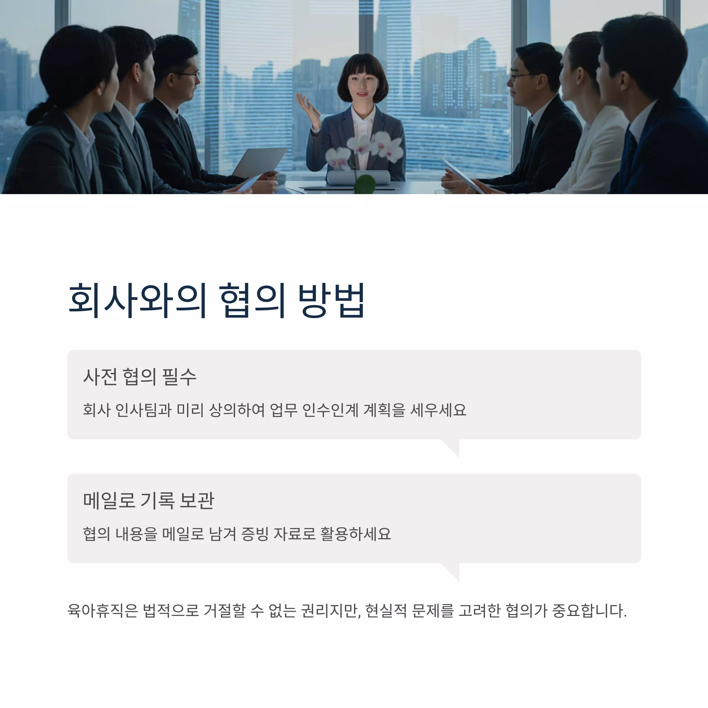 회사 인사팀과 사전 협의하는 것이 매우 중요합니다. 육아휴직은 법적으로 거절할 수 없는 권리지만, 대체 인력이나 부서 조정 등의 현실적 문제가 있을 수 있으므로 메일로 협의 내용을 남기는 것도 좋은 방법이에요.