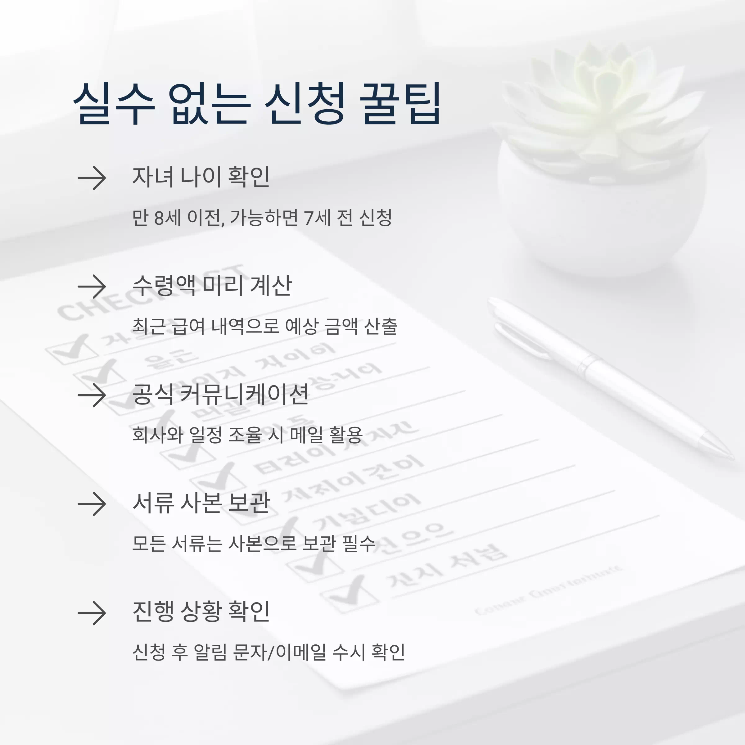 - ✔ 자녀 나이 기준 만 8세 이전, 가능하면 7세 전 신청