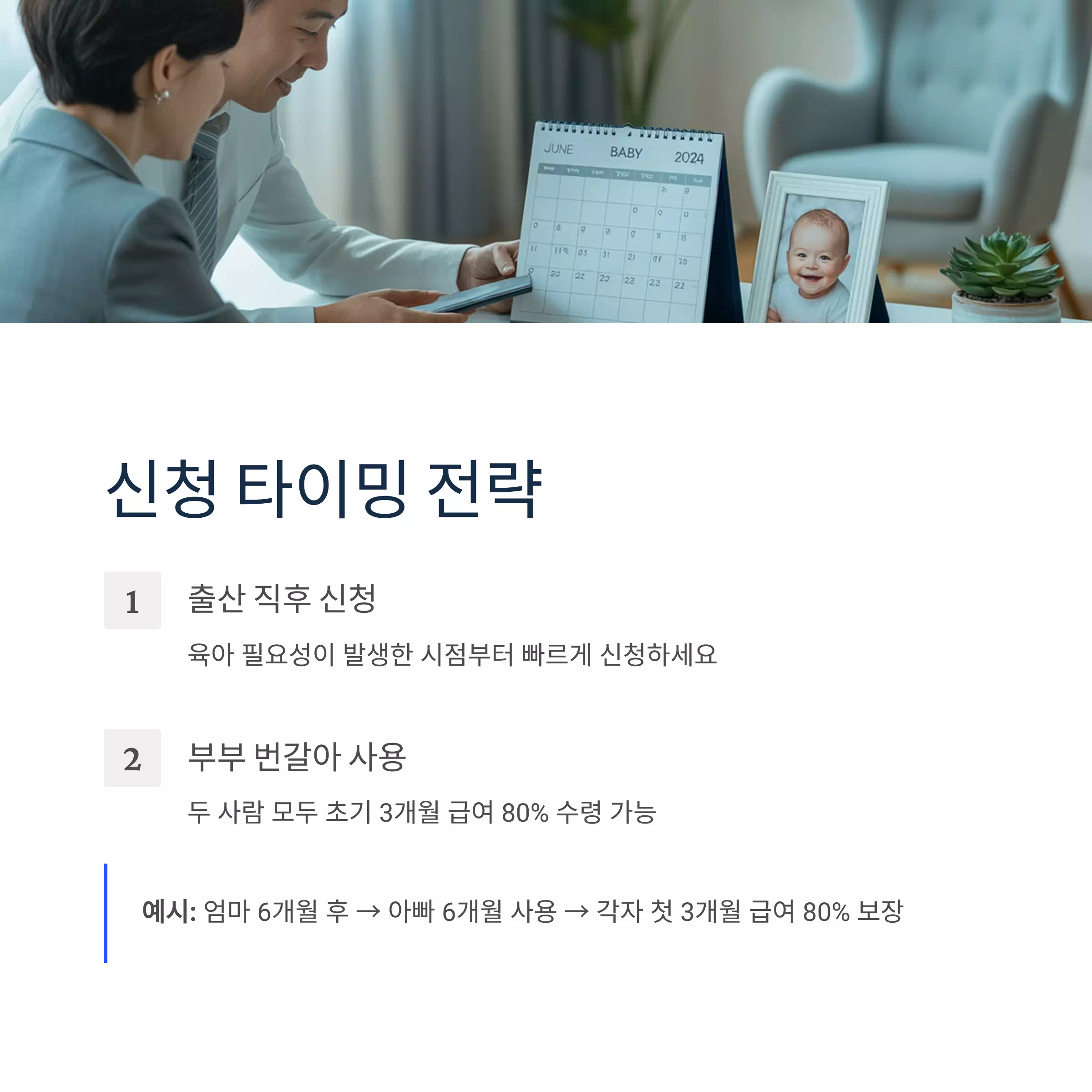 예: 엄마 6개월 후 → 아빠 6개월 사용 → 각자 첫 3개월 급여 80% 보장