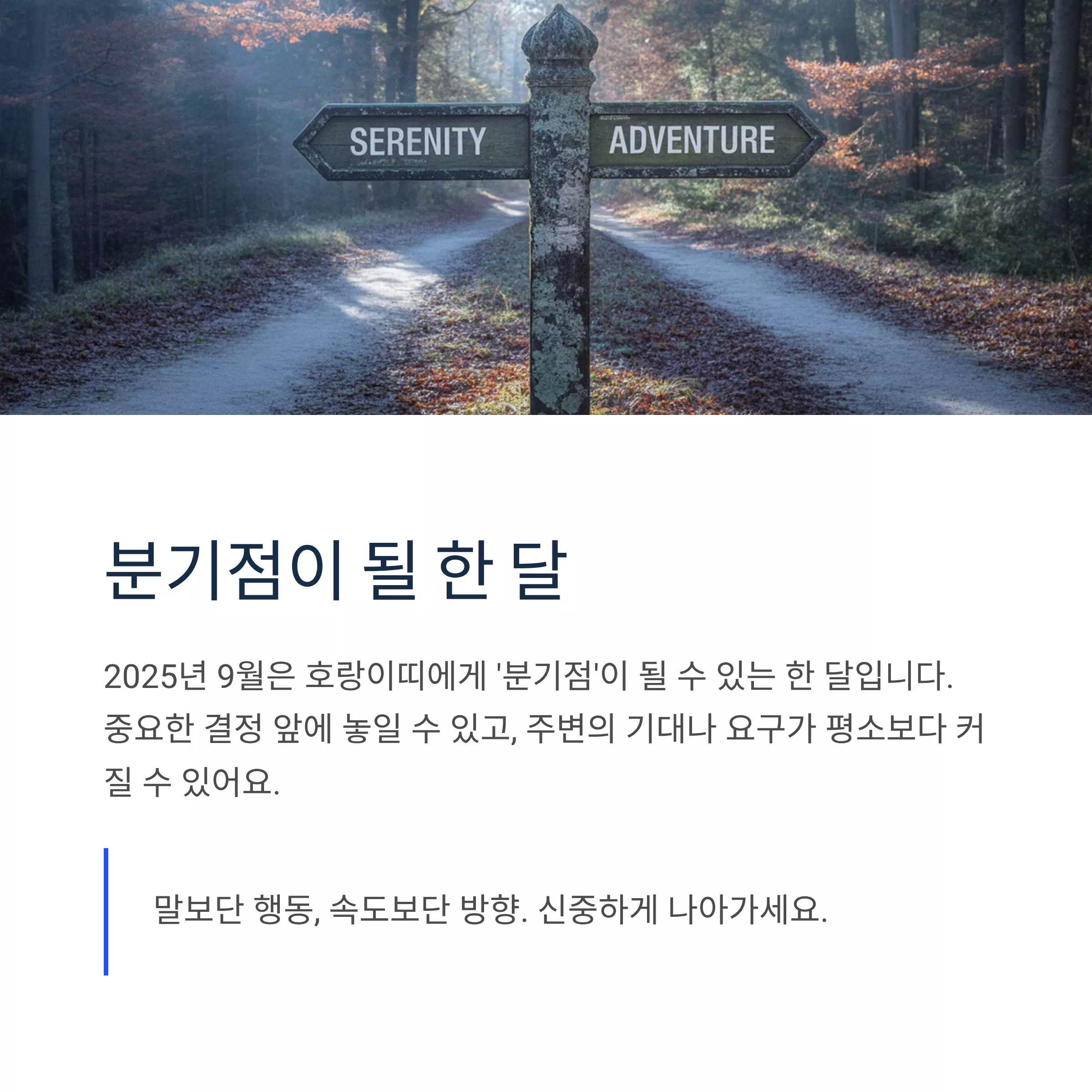 2025년 9월은 호랑이띠에게 '분기점'이 될 수 있는 한 달입니다. 중요한 결정 앞에 놓일 수 있고, 주변의 기대나 요구가 평소보다 커질 수 있어요. 감으로 밀어붙이기보다는 냉정하고 전략적으로 움직여야 할 때입니다. 말보단 행동, 속도보단 방향. 신중하게 나아가세요.