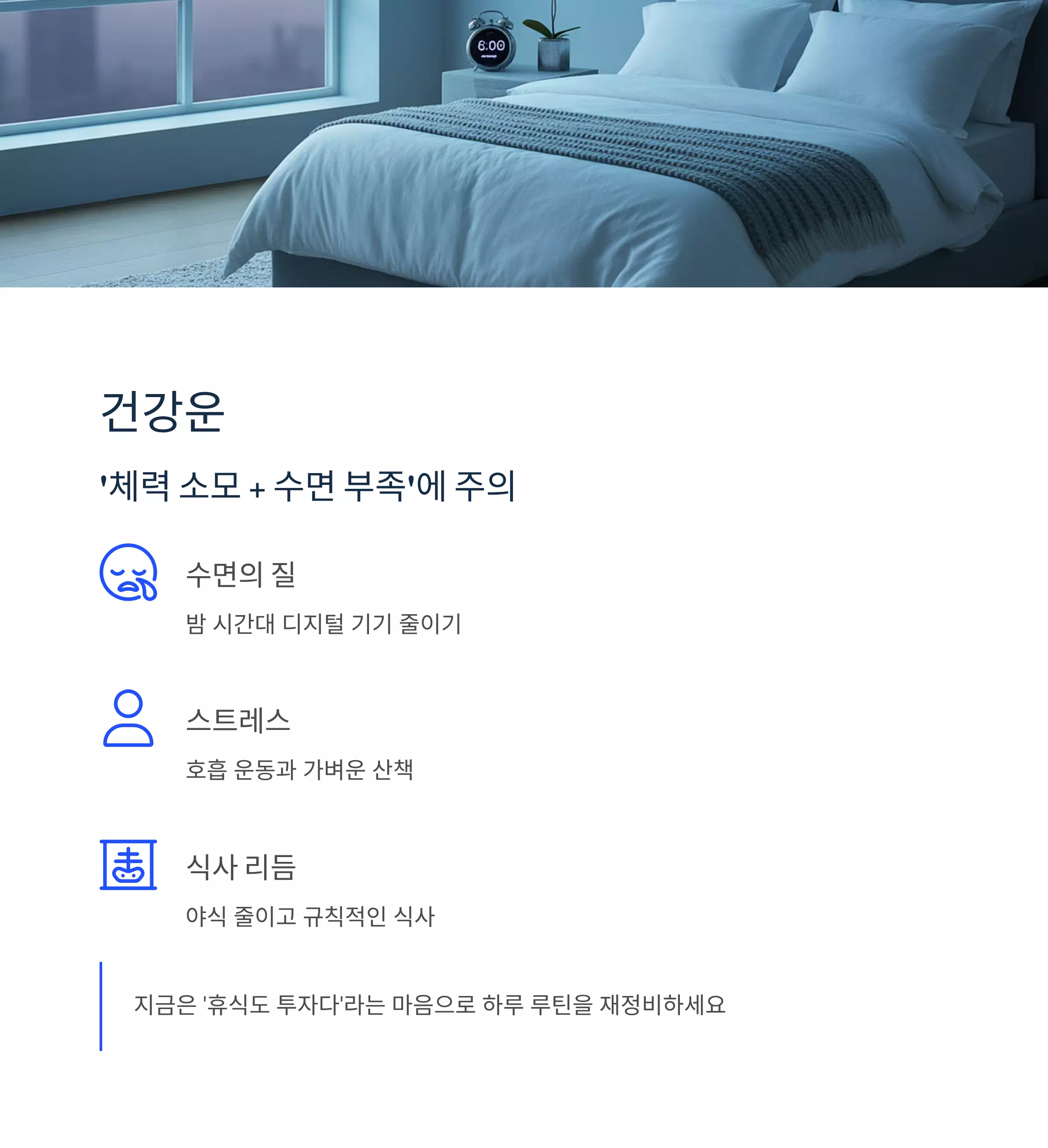 몸 상태는 크게 나쁘지 않지만, 스트레스로 인한 피로 누적이 문제입니다. 수면 시간이 짧아지면 쉽게 짜증이 나고 집중력이 떨어질 수 있어요. 지금은 '휴식도 투자다'라는 마음으로 하루 루틴을 재정비하세요.
