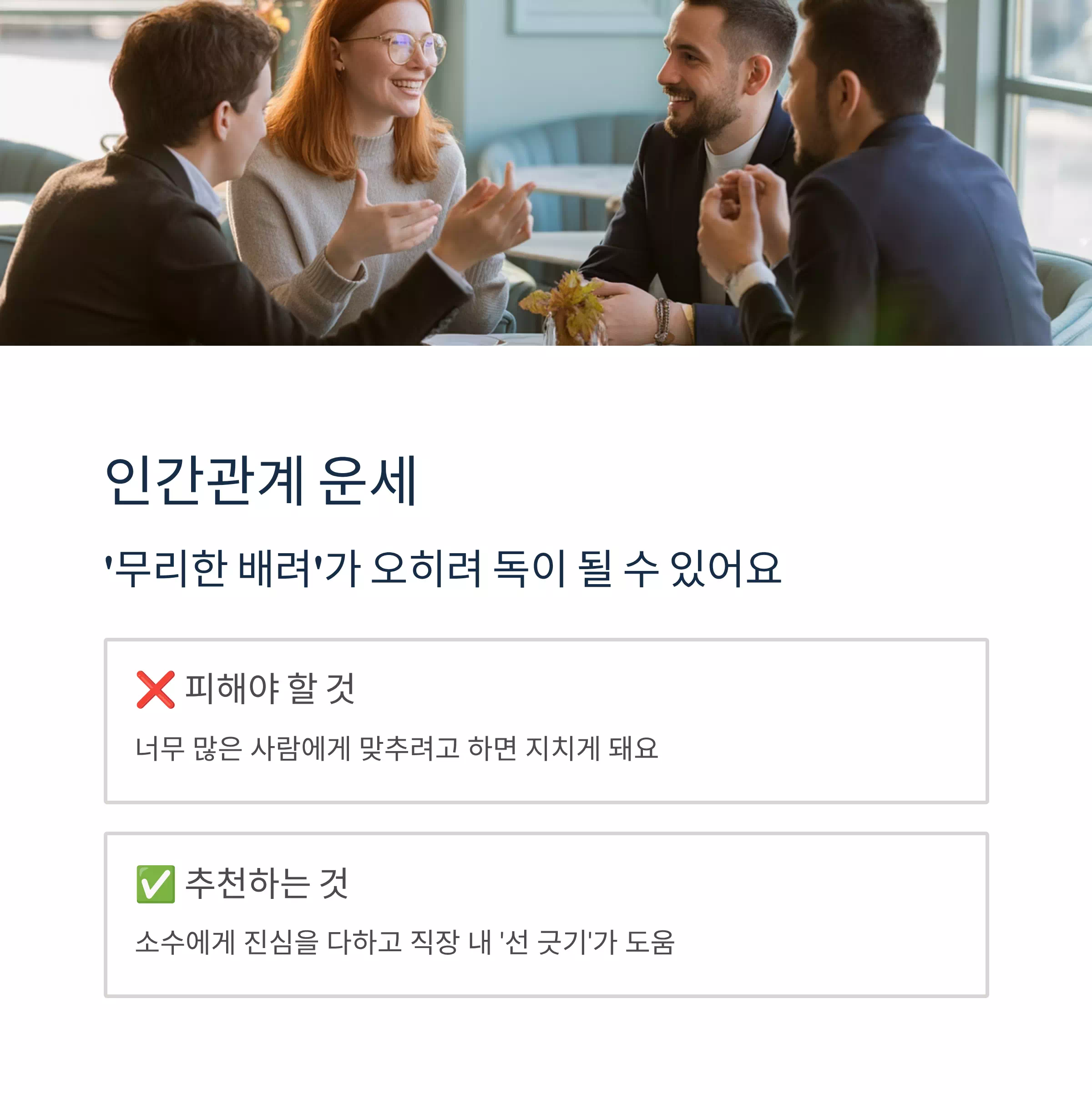 9월엔 너무 많은 사람에게 맞추려고 하면 지치게 돼요. 누구에게나 좋은 사람이 되기보단, 소수에게 진심을 다하세요. 특히 직장 내 인간관계에선 ‘선 긋기’가 생각보다 큰 도움이 됩니다.