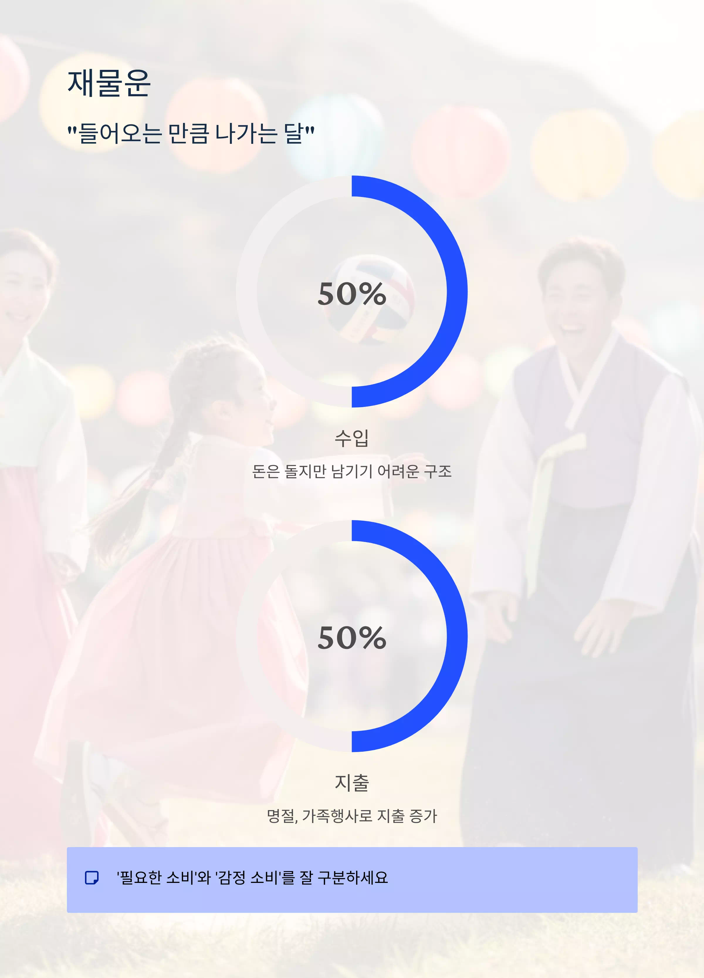 수입과 지출의 흐름이 맞물리기 때문에 돈은 돌지만 남기는 어려운 구조입니다. 특히, 명절이나 가족행사 등 지출이 많아지는 달인 만큼 계획이 필수예요. '필요한 소비'와 '감정 소비'를 잘 구분하세요.